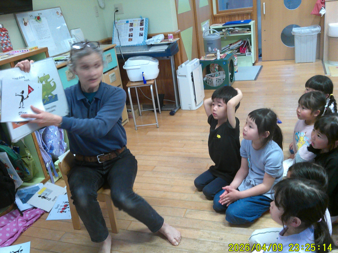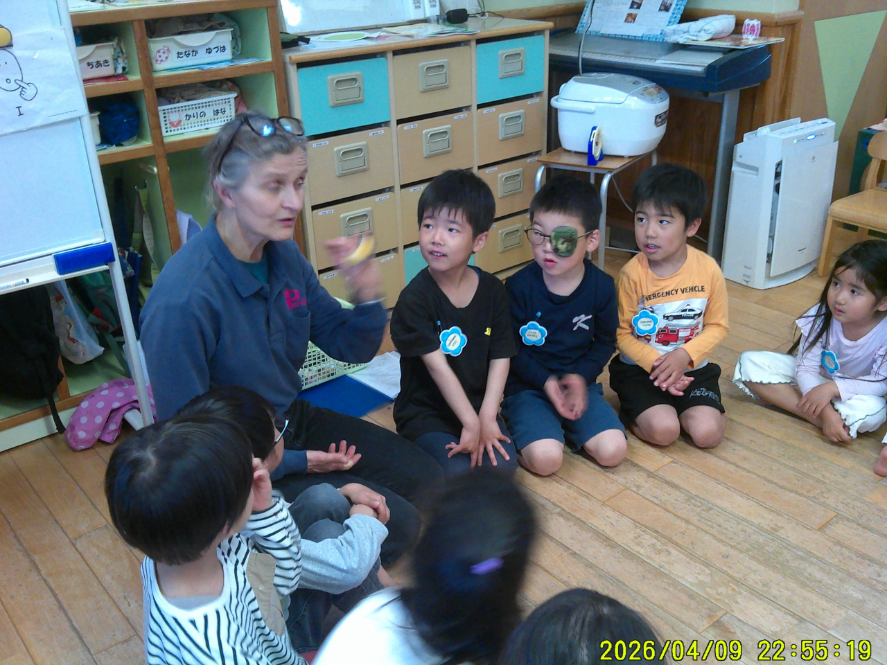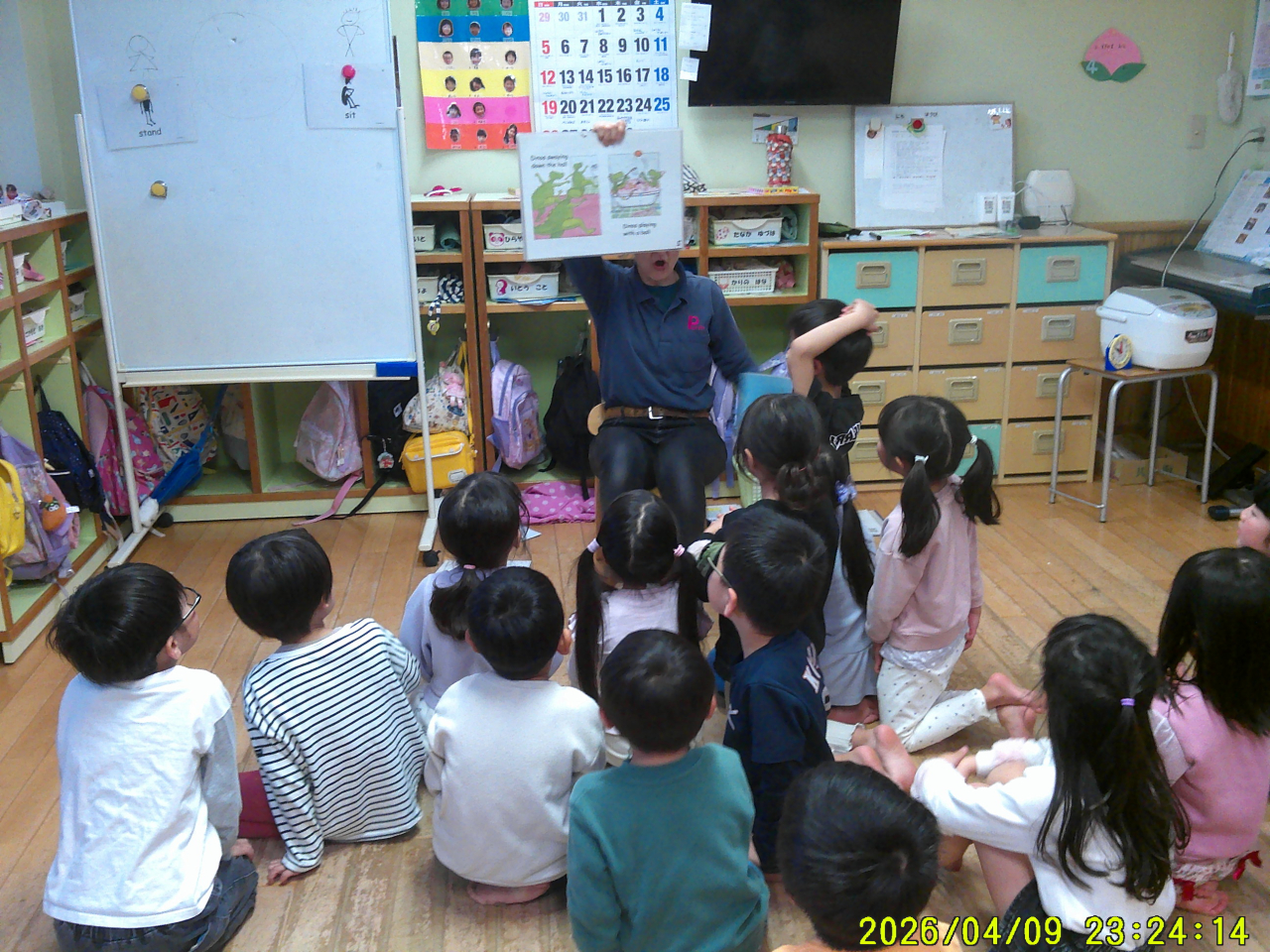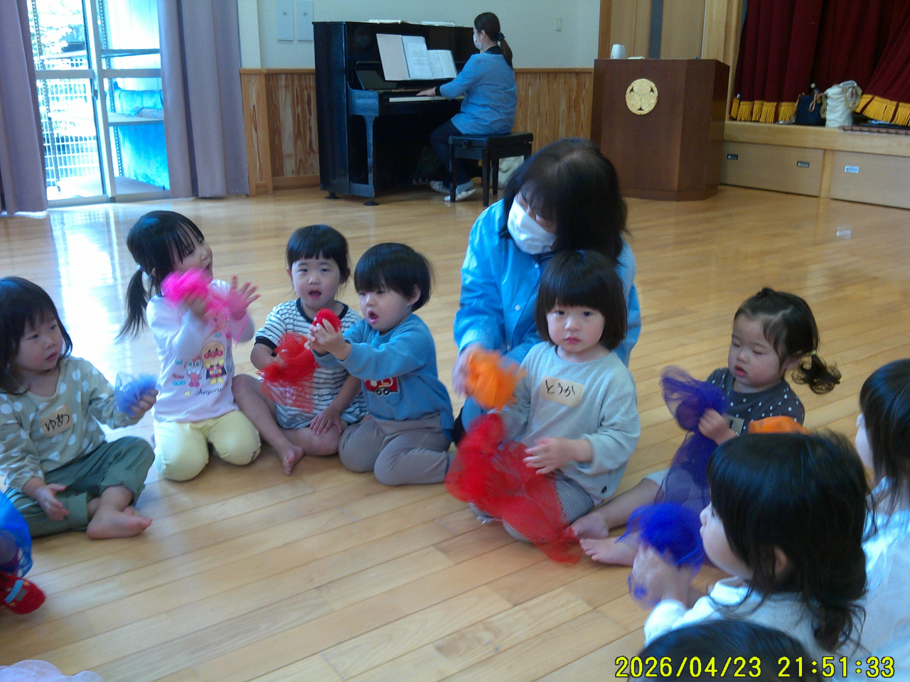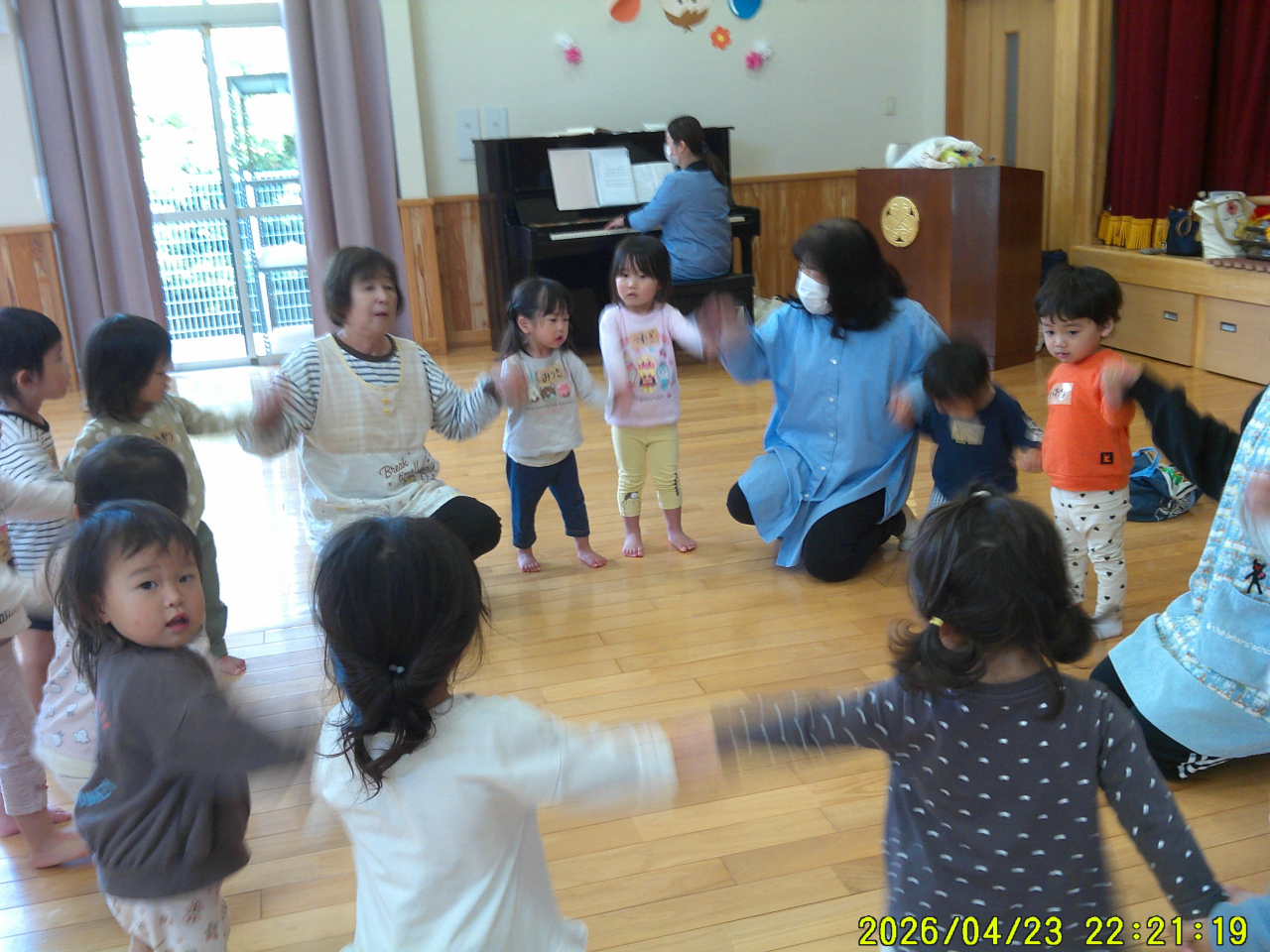 4月10日(金)1回目の英語の日!なんだか緊張している様子のめろん組さんでした。レネエ先生を待っている間はドキドキソワソワでしたが、レネエ先生の「Hello!!」の一声でリラックス♡楽しくなったみんなです。うたを歌ったり、絵本を読んでもらったり、あっという間の1時間でした。