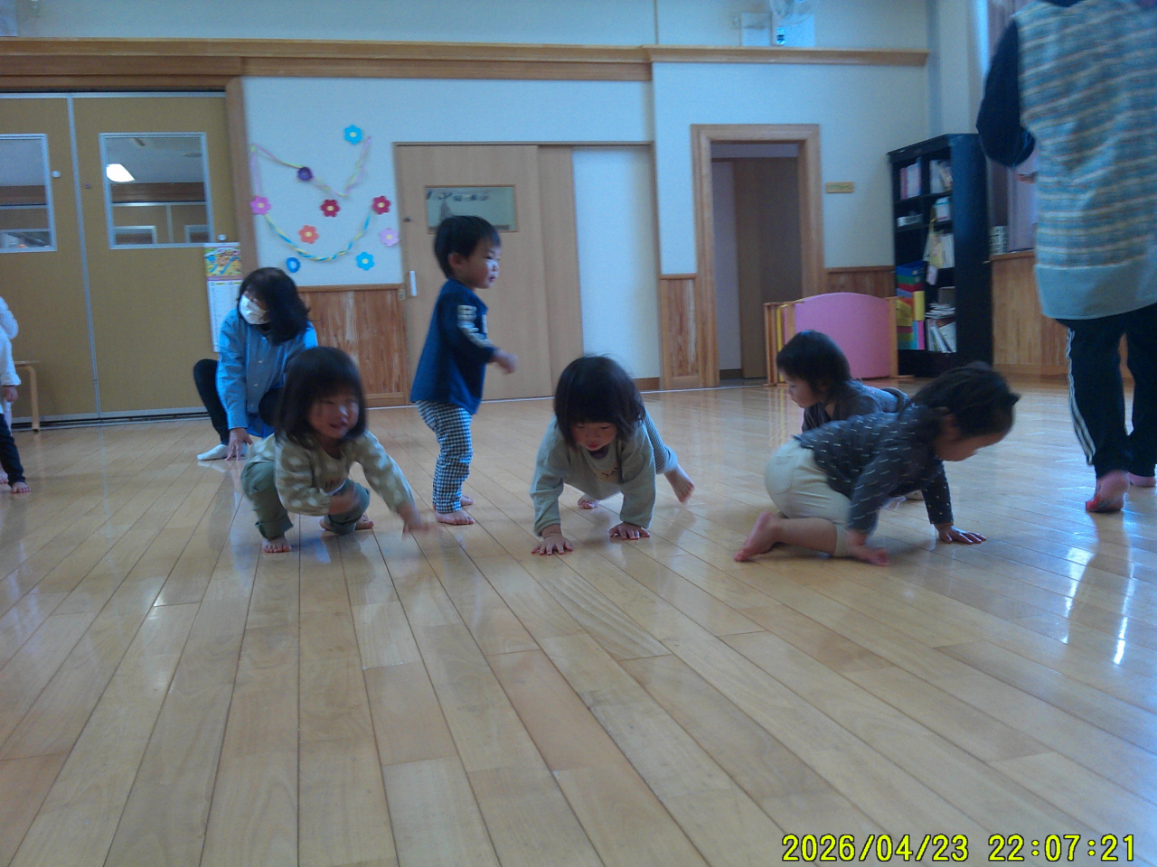 ぶどう組さんにとって初めてのあすトレ運運動教室の日でした。楽しみと緊張でちょっぴりドキドキしていましたが、身体をしっかり動かして楽しみました。はじめにコーチが「たけコーチ知ってる人?」と聞くと半分以上の子が元気よく「はーい」と手をあげていました😊ジャンプをしたり、走ったり、くまやカエルの動きなど・・・ちょっぴり難しい動きにも挑戦!!ぶどうさんのかわいい動きが見れました♡これからも楽しんでいこうね
