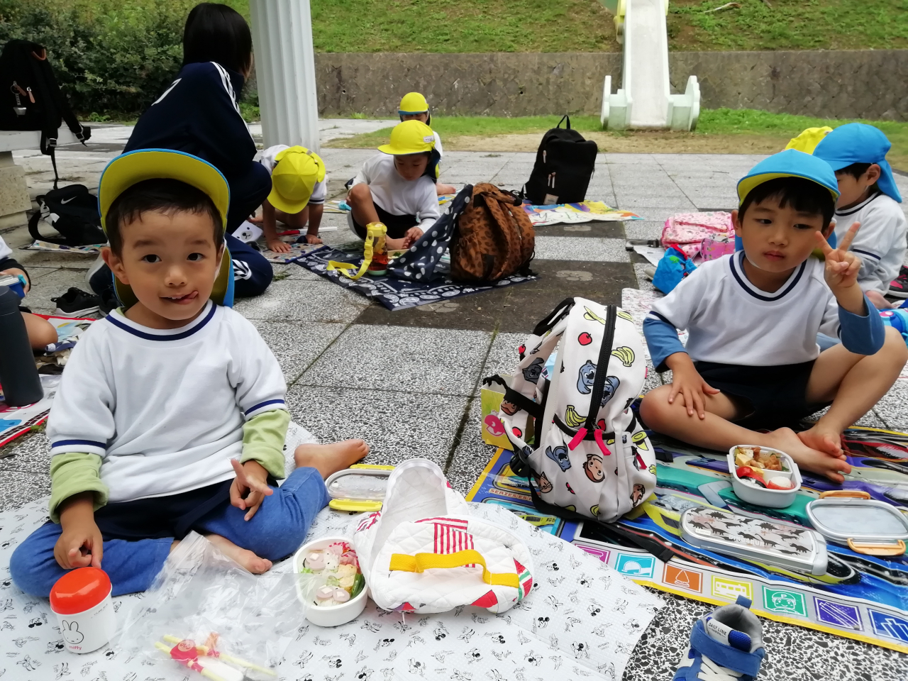 初めての上吉田公園に行ってきました。龍のすべり台で大興奮で、何度も何度も繰り返し楽しむお友だちがたくさんいました。どんぐりやしいの実ひろいやダンゴムシ探しにも夢中になっていました。遠足先で食べるおやつやお弁当は特別でみんな嬉しそうに食べていました。準備等ありがとうございました。「また明日いこー」と帰り道に言っていました♡