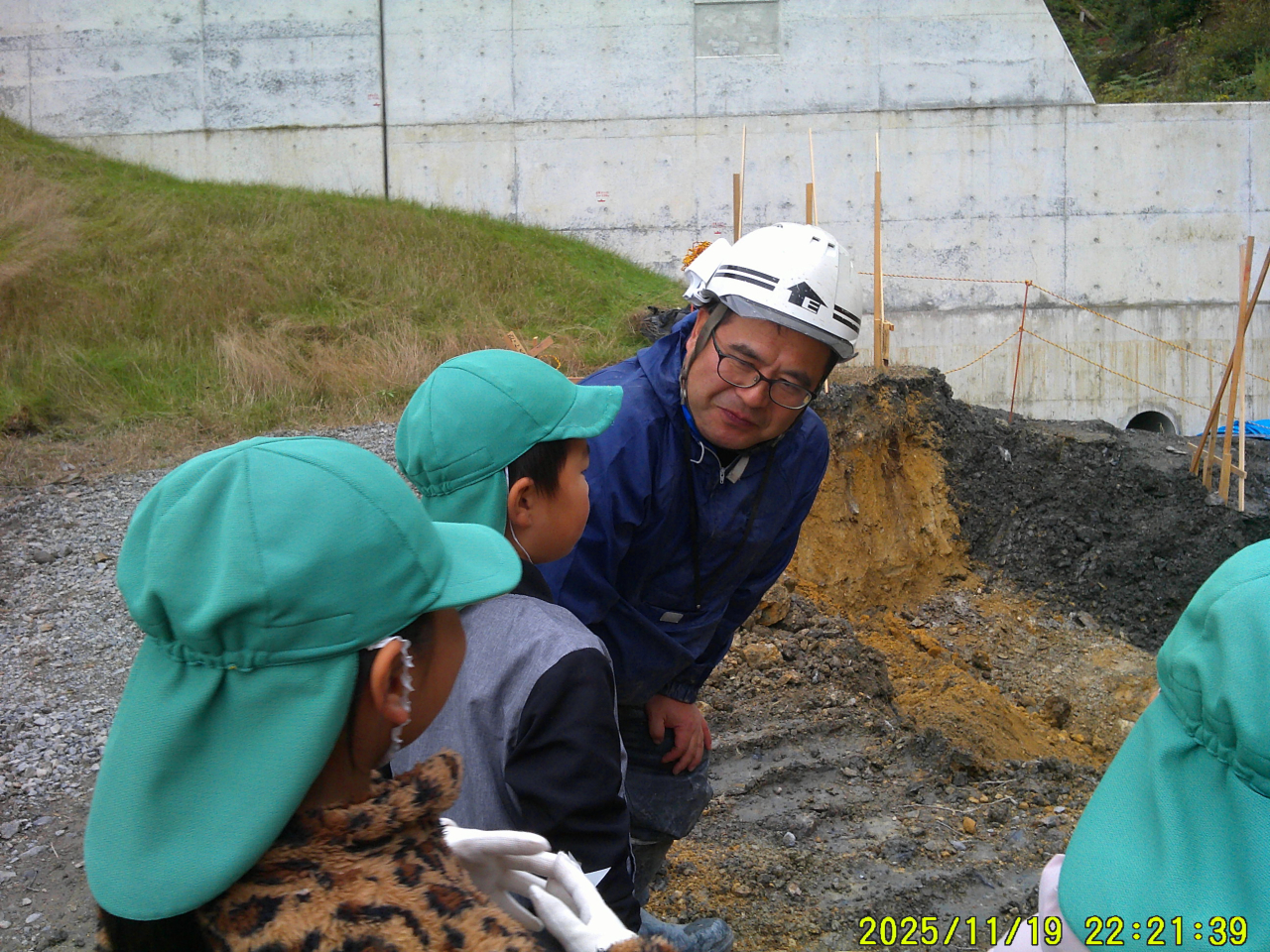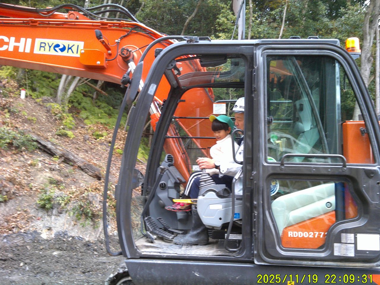 11月20日(木)益中の少し先で工事をしておられる徳栄建設さんに「ショベルカー見においで!」とお誘いをうけたので、早速出かけました。大きく深く掘ってある穴に驚き、ショベルカーを運転させてもらい喜び、短い時間でしたが楽しんでいました。「またおいで」と声をかけてもらい、更に大喜びです。徳栄さん!ありがとうございました。