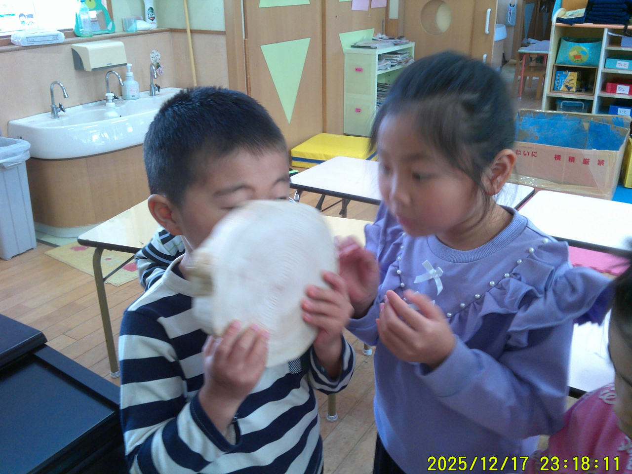 えんぴつけずり作りを体験しました。初めに木や葉っぱの名前や手ざわり、においを体験し「いいにお~い」「無印のにおいがする~」など、色々な意見が出ました。そしていよいよえんぴつけずりへ。やすりで擦り「え~つるつるする~」「やすりが白くなった」とワクワク♪そこから絵を描き、世界で一つだけのえんぴつけずりが出来ました♡持って帰れることがわかると更に目がキラキラになり大喜び!!「お姉ちゃんに見せよ~」「家族に見せよ~」と最後までキラキラワクワクなめろんさん達でした。4月から小学生。大切に使ってくれると嬉しいな♡来月は親子でイス作り。楽しみです😊