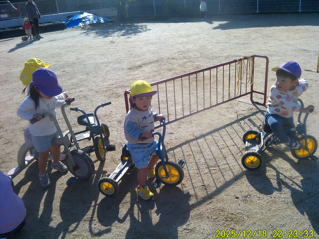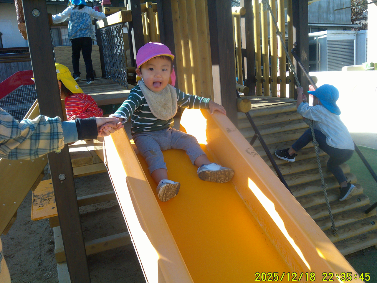 今日も園庭は大にぎわいです。たくさんのクラスが園庭に出て遊んでいます。すべり台、砂場、ボール遊び、三輪車などなど・・・自分の好きな場所でしたい遊びを存分に楽しんでいます。あちこちで子どもたちの❝わくわく❞が広がっていて見ている先生たちもわくわくしています。たのしいねっ♡