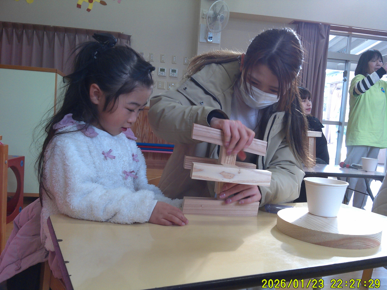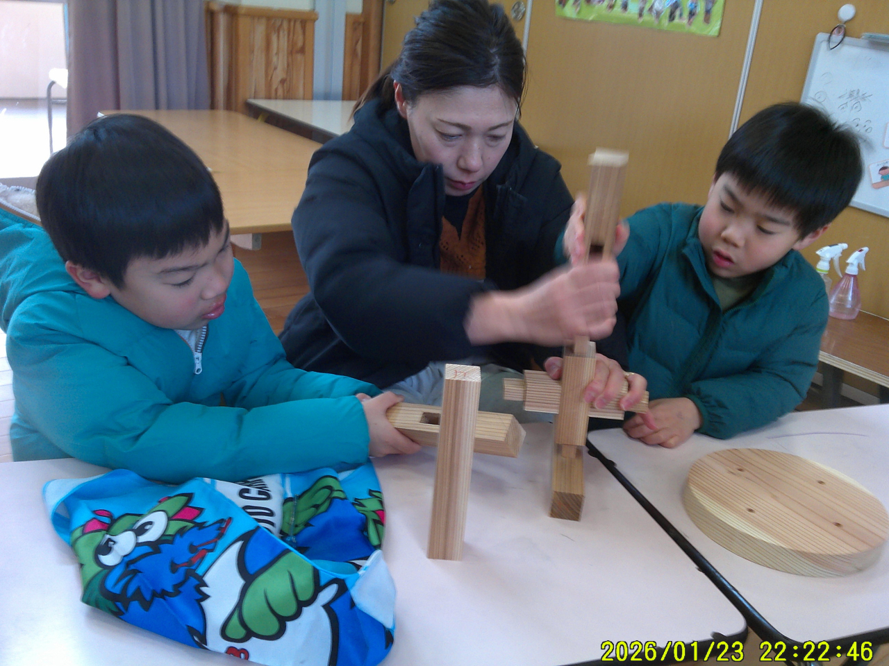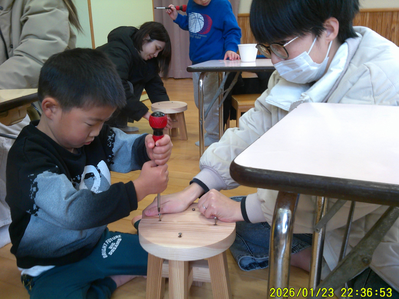 24日(土)コアラッチさんをお招きし、親子で椅子を作りました。はめこみから、ネジ入れ、やすりでこするなど体験し、やる気と楽しさでギラギラしていました☆「こうしたらいいんじゃない?」「ここ押さえとって」など、やりとりをしながら、親子で力を合わせて一つの物を作り上げる様子はとてもステキでした♡できた椅子は記念に持って帰りました。家で「絵を描いたよ」「シール貼った」「ニス塗ってくれるって~」など、更に作りあげられた様子です😊