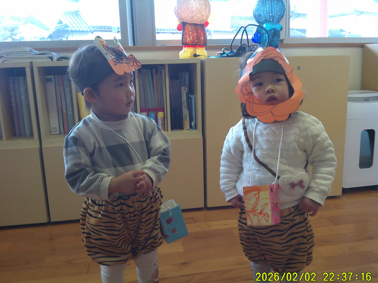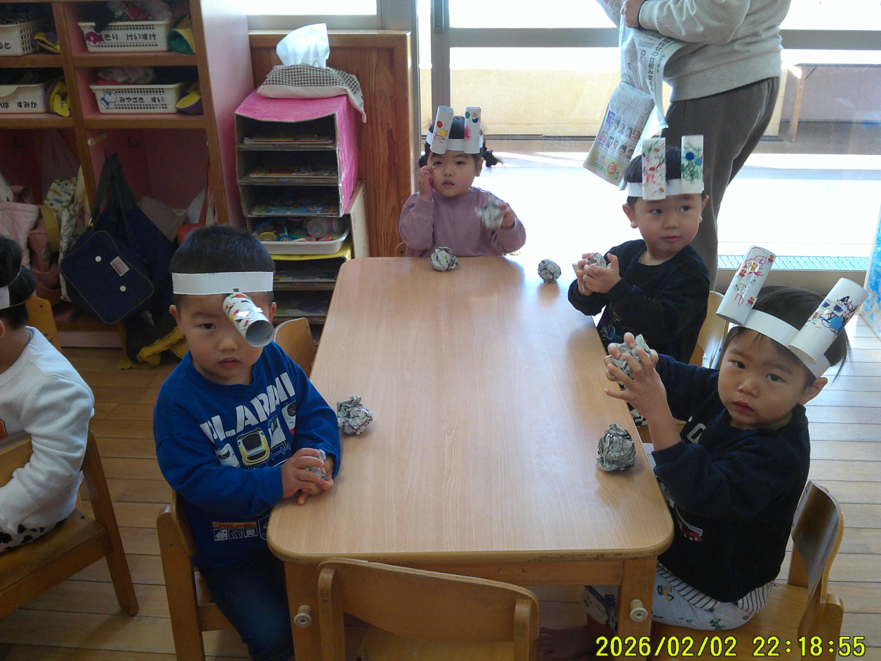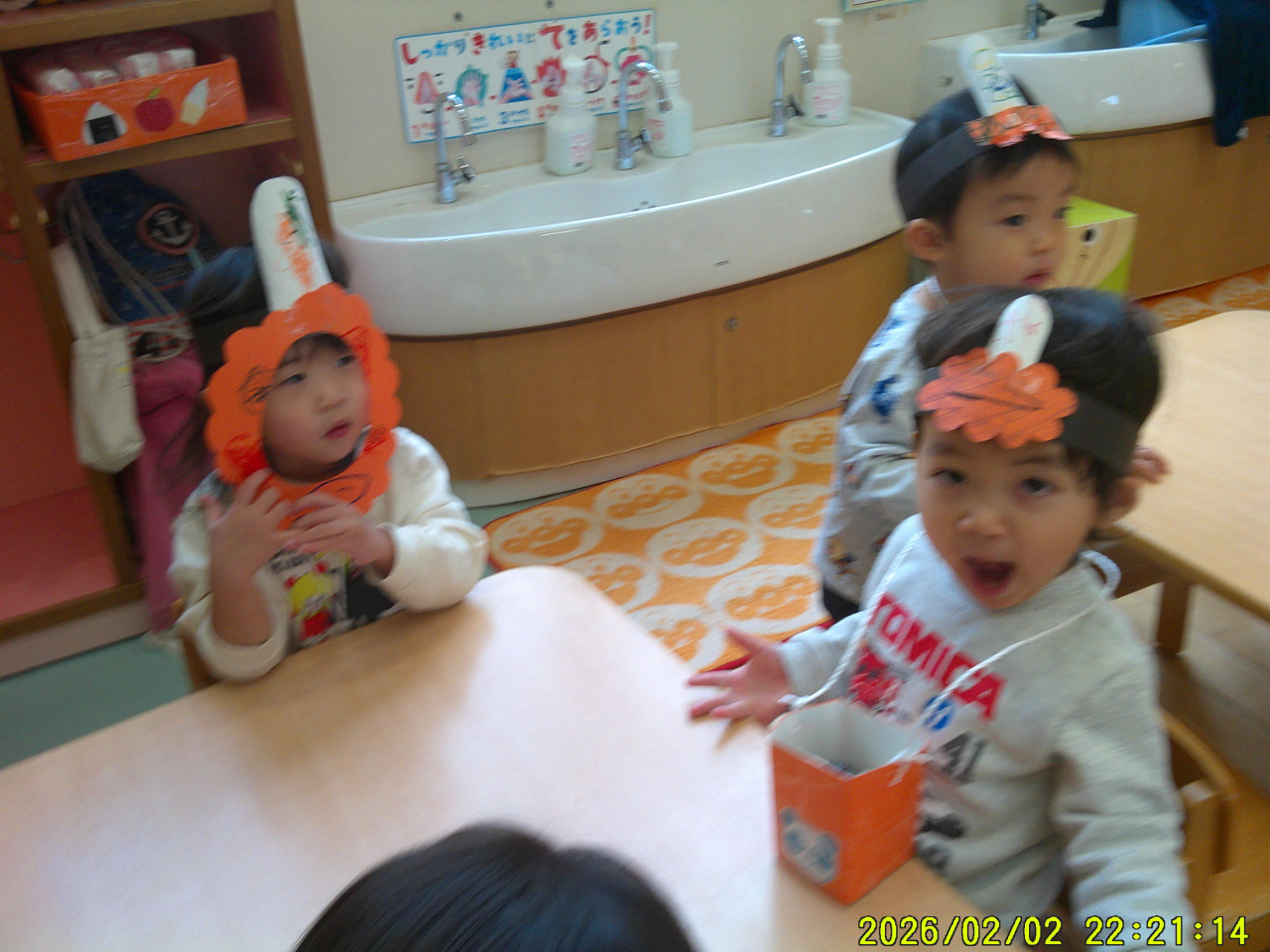 2月3日(火)豆まきをしました。各クラスとても楽しそうに豆まきをしていました。小さいクラスのお友だちは、オニのパンツをはいて園内を歩いていました。大きいクラスのお友だちは、節分について絵本を見たり、自分の心の中にいるオニの絵をかいて、豆を投げてやっつけました。給食の先生も頑張りました。節分ランチおいしかったです