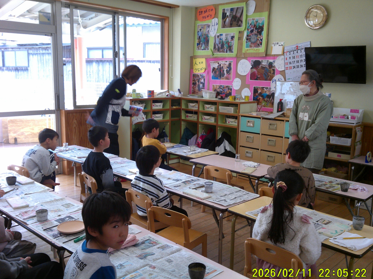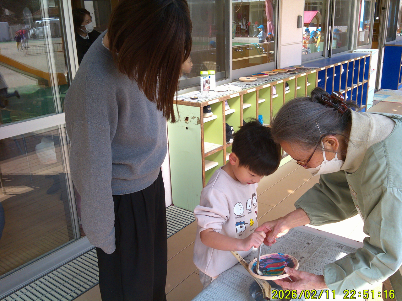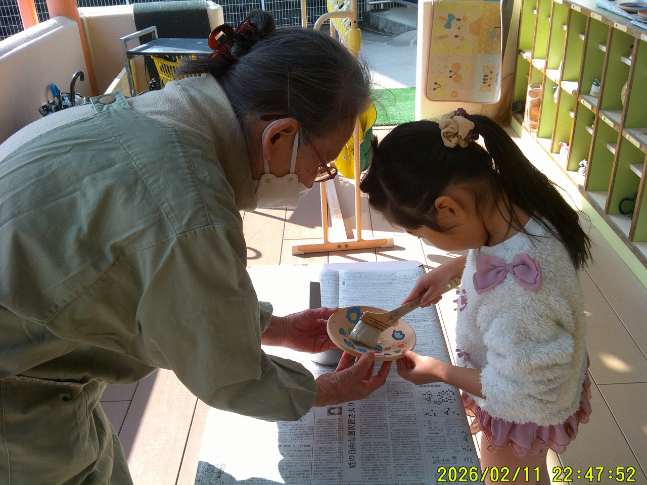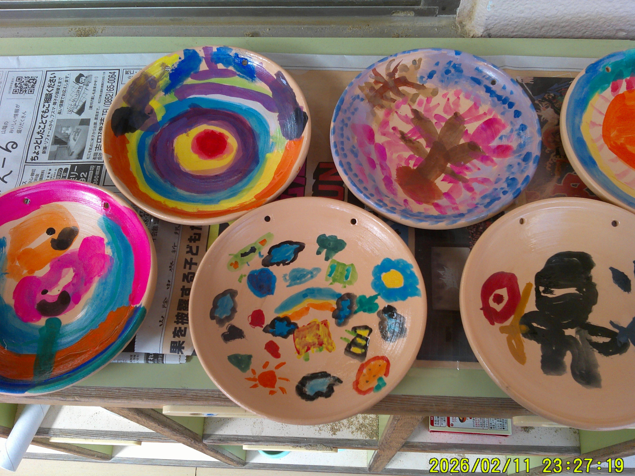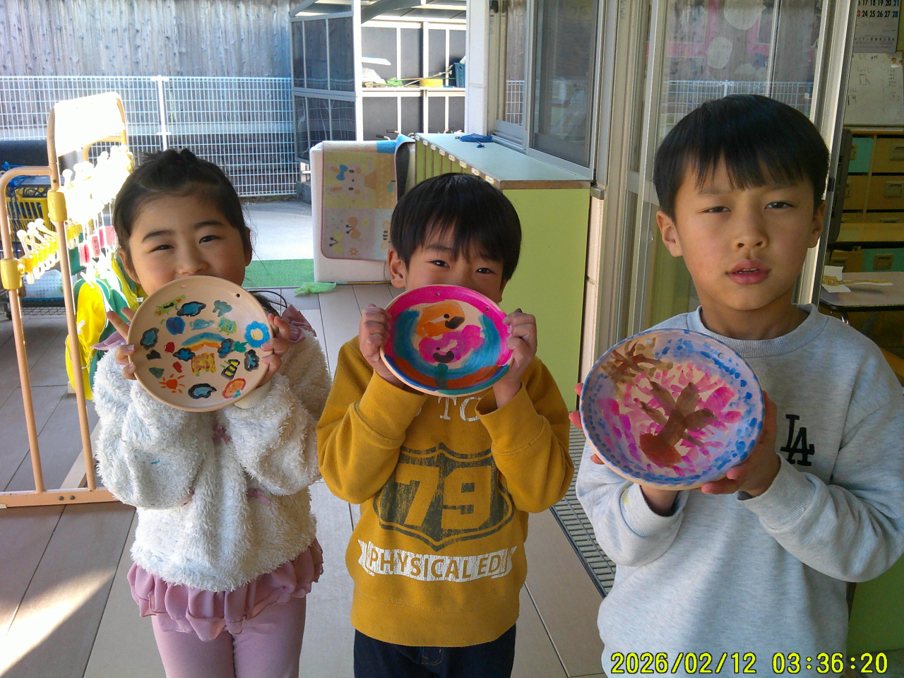 2月12日(木)今年も福郷様にお世話になり、お皿に絵を描きました。何を描こうか決めていたお友だちもいて、サッと描きはじめたり、じっくり考えゆっくりと描きはじめたお友だちもいました。ニスを塗りお皿がピカピカになったり、色が鮮やかになったのを見て「わぁ~きれい♡」と喜んでいました。ステキなお皿に仕上がりました。