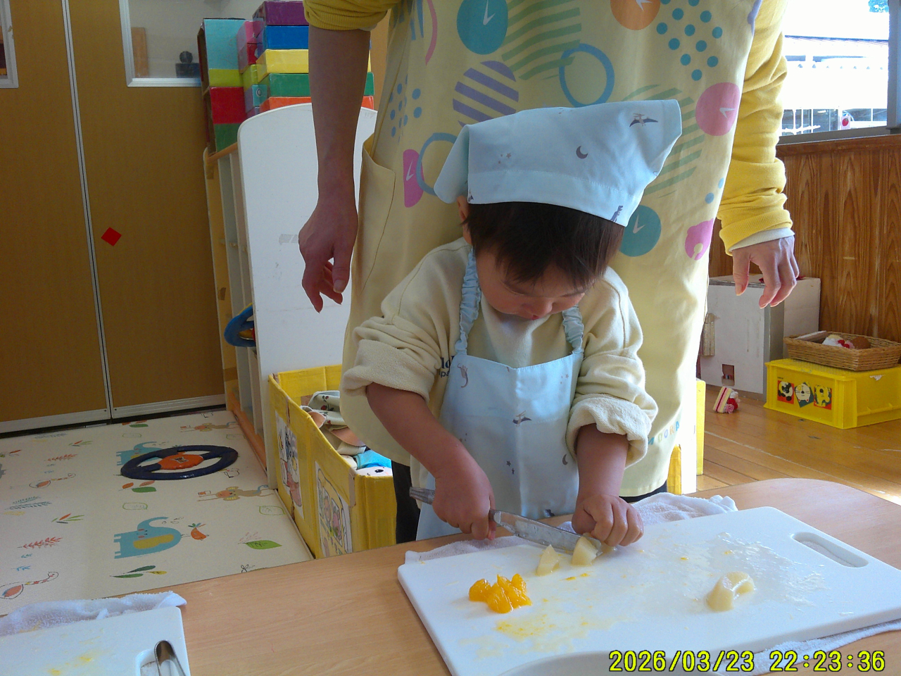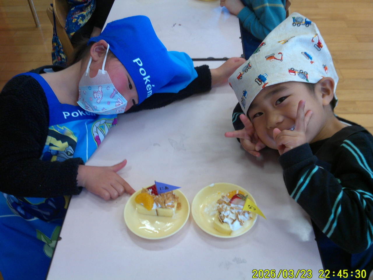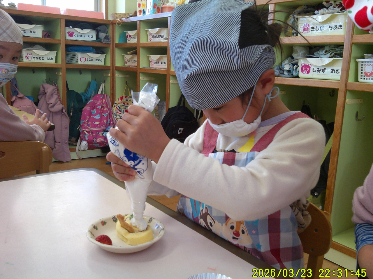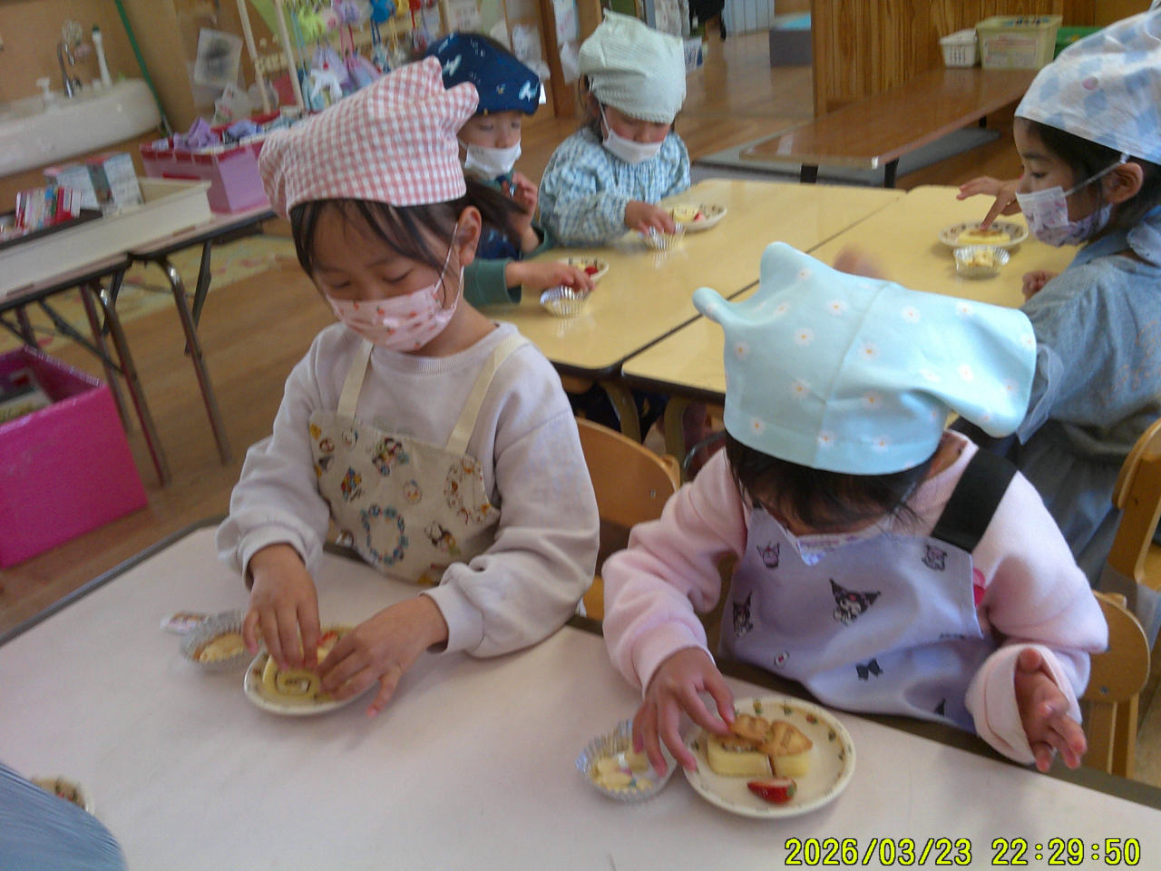 3月24日(火)みんなでケーキを作りました。大きいクラスのお友だちはロールケーキを立てたり横にしたり、色々と考えてトッピング!小さいクラスのお友だちは、いい香りに誘われておもわずパクッ・・・と食べてしまいそうでした