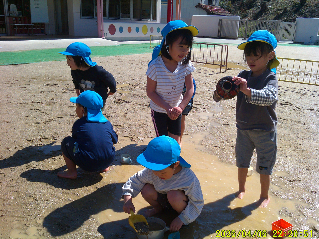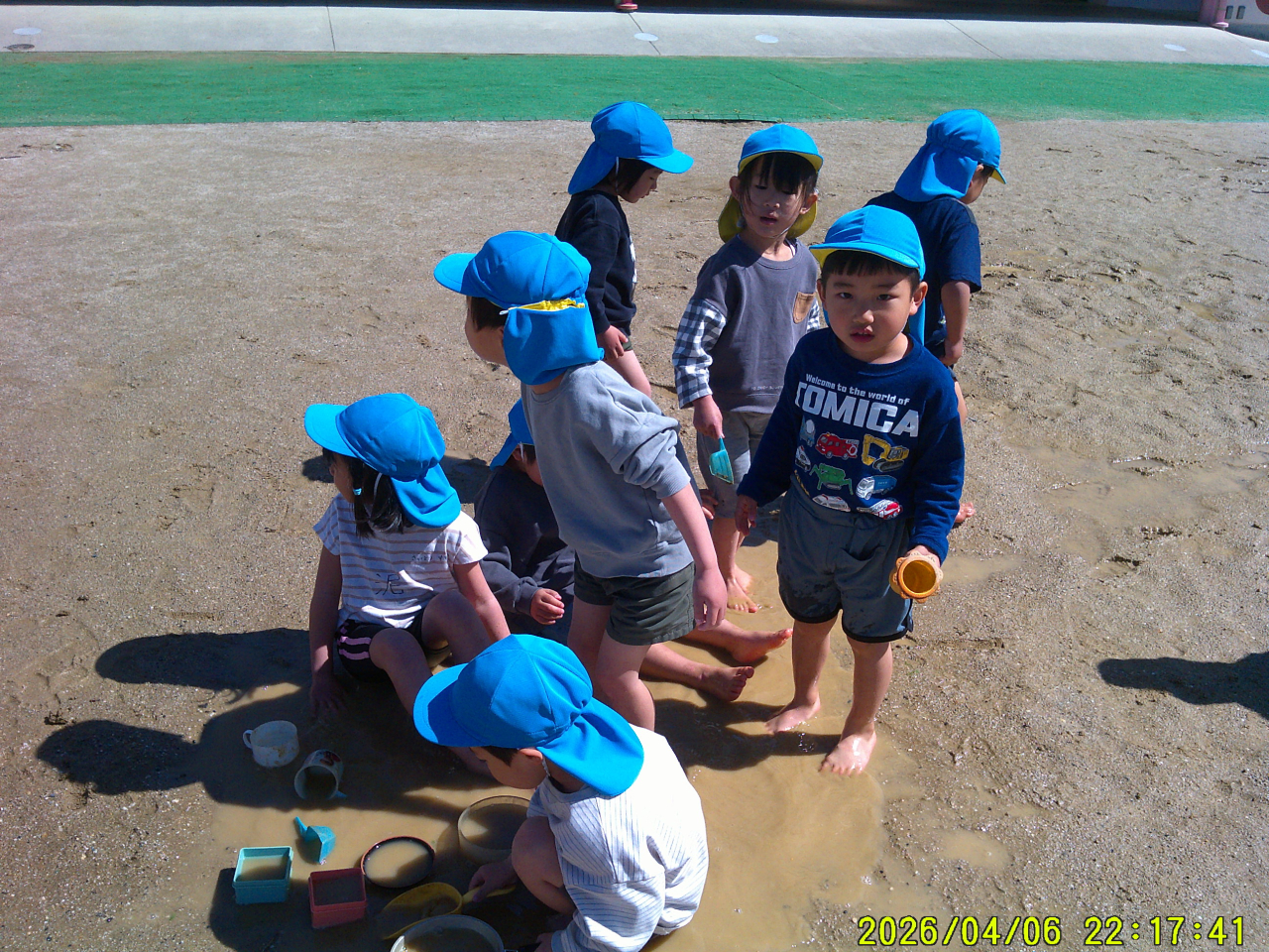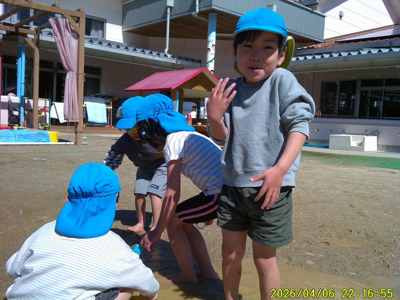 今日も園庭の大きな水たまりは子どもたちの大好きな楽しい場所となりました。ぶどう2組さんが大喜びで出てきました。水をすくったり座りこんで遊ぶのはもちろん!発見もたくさんです。あたたかい水たまりと冷たい水たまりがあることに気づいたようでした。たっぷり遊び、その後はシャワーを浴びてさっぱり・・・です。