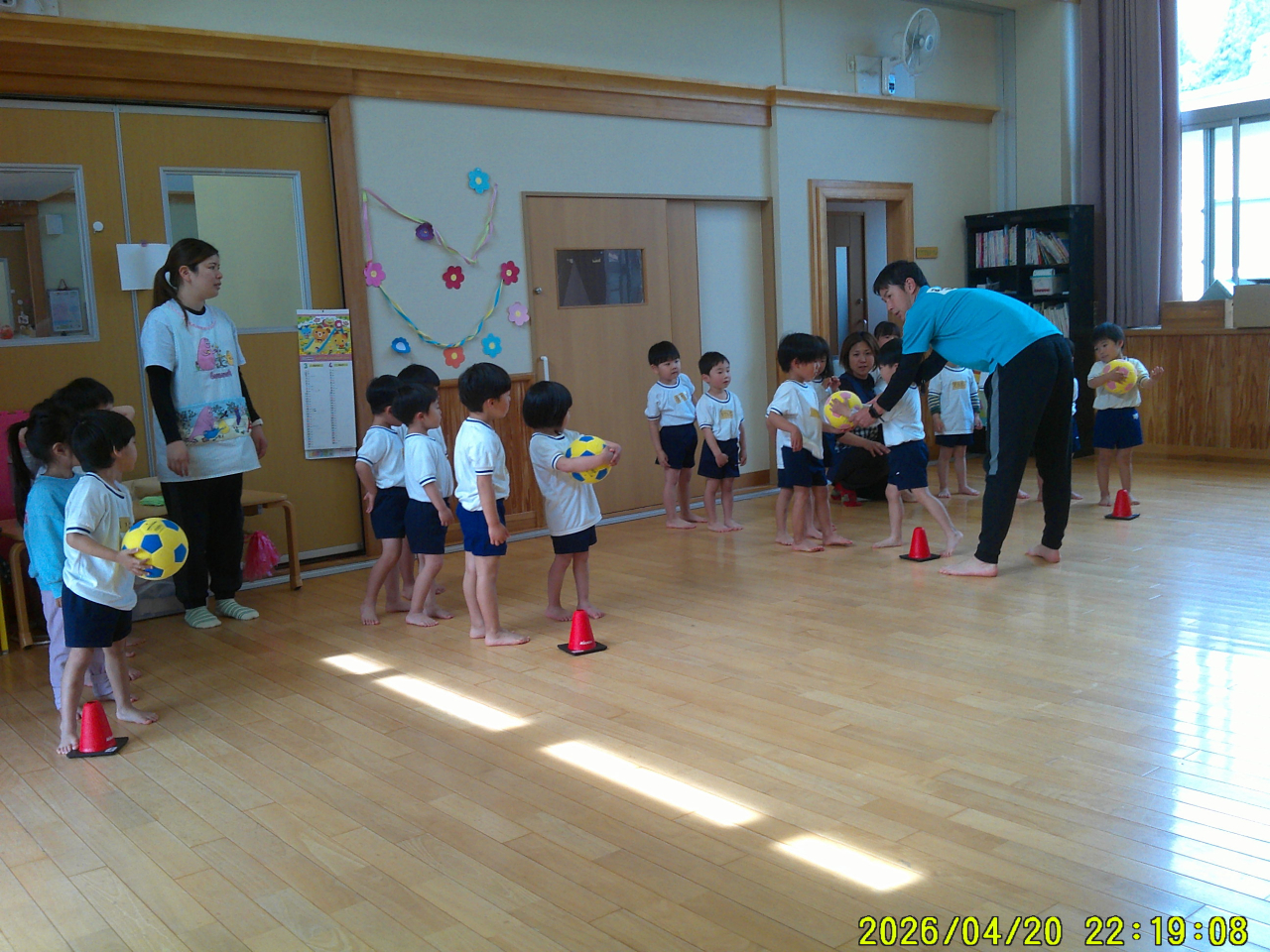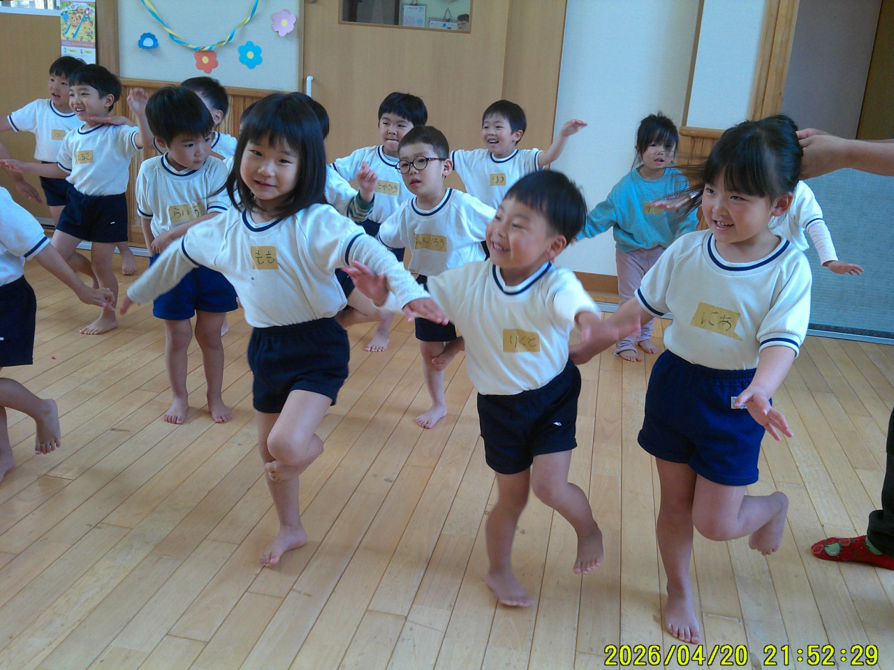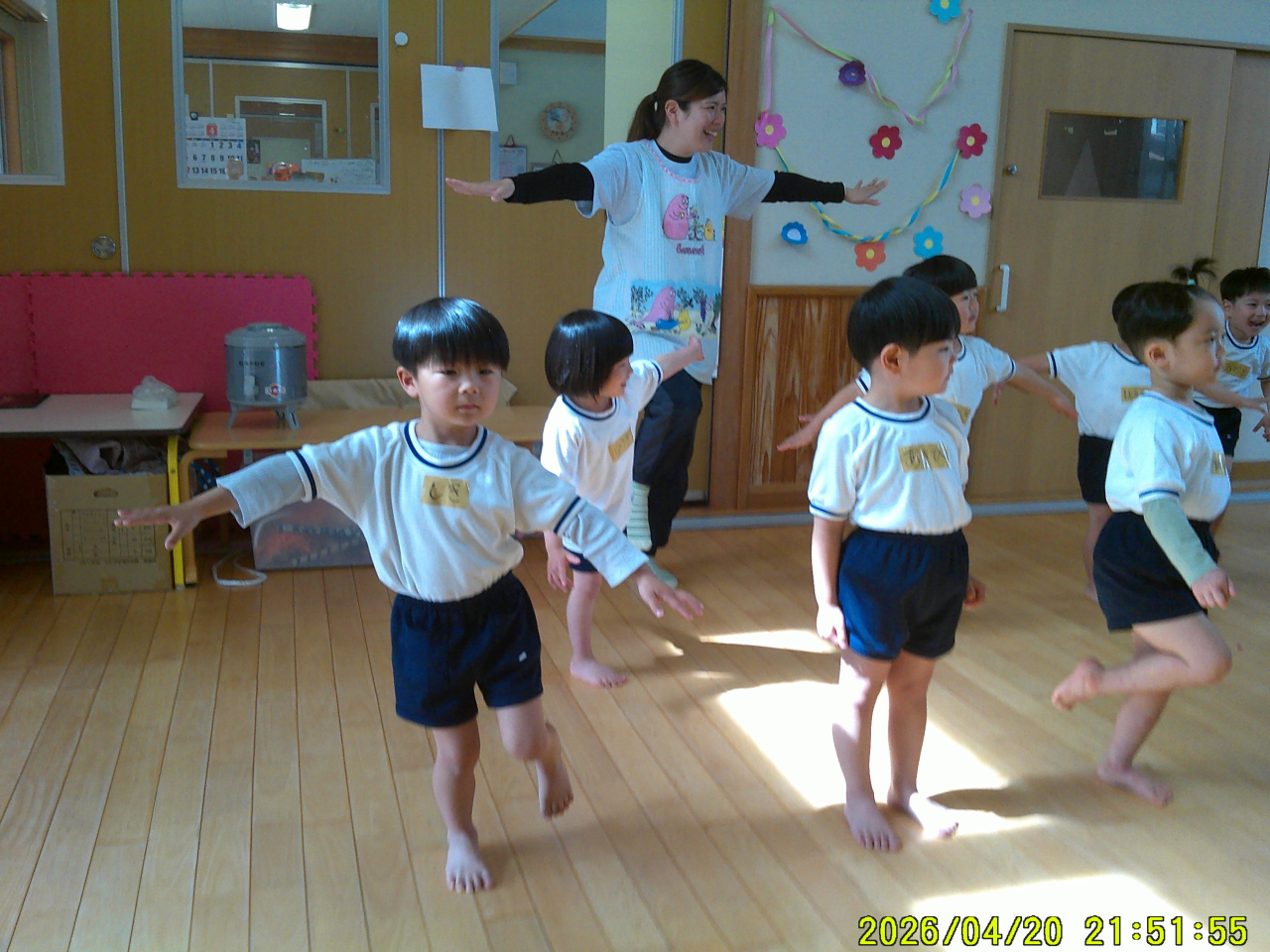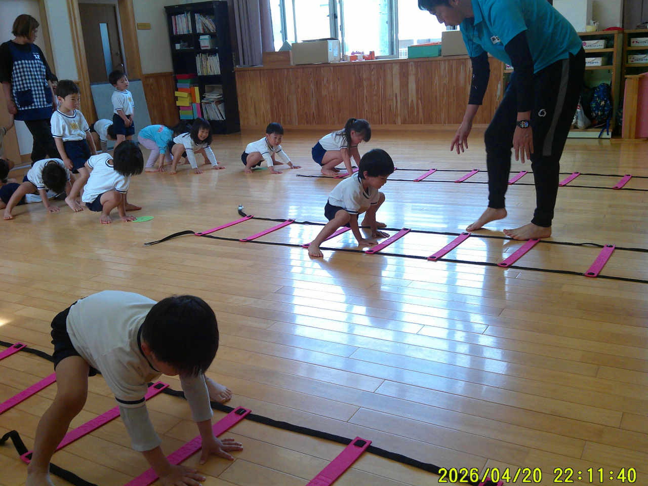 ぶどう組さんにとって初めてのあすトレ運運動教室の日でした。楽しみと緊張でちょっぴりドキドキしていましたが、身体をしっかり動かして楽しみました。はじめにコーチが「たけコーチ知ってる人?」と聞くと半分以上の子が元気よく「はーい」と手をあげていました😊ジャンプをしたり、走ったり、くまやカエルの動きなど・・・ちょっぴり難しい動きにも挑戦!!ぶどうさんのかわいい動きが見れました♡これからも楽しんでいこうね