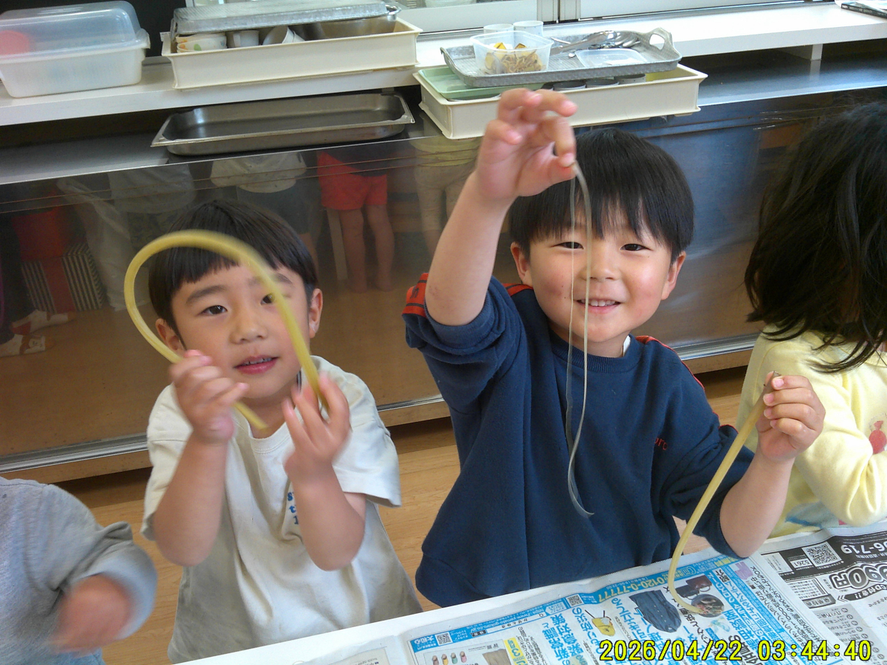 4月20日 ベジばぁばから❝ふき❞が届きました。早速すじをとることに・・・。給食先生が「ふきのすじとるの手伝ってくれる人、来てね」と声をかけると集まってきました。すじのとり方を教えてもらい「楽しいね~」と言いながらお手伝いしてくれました。給食のふきご飯!おいしかったね