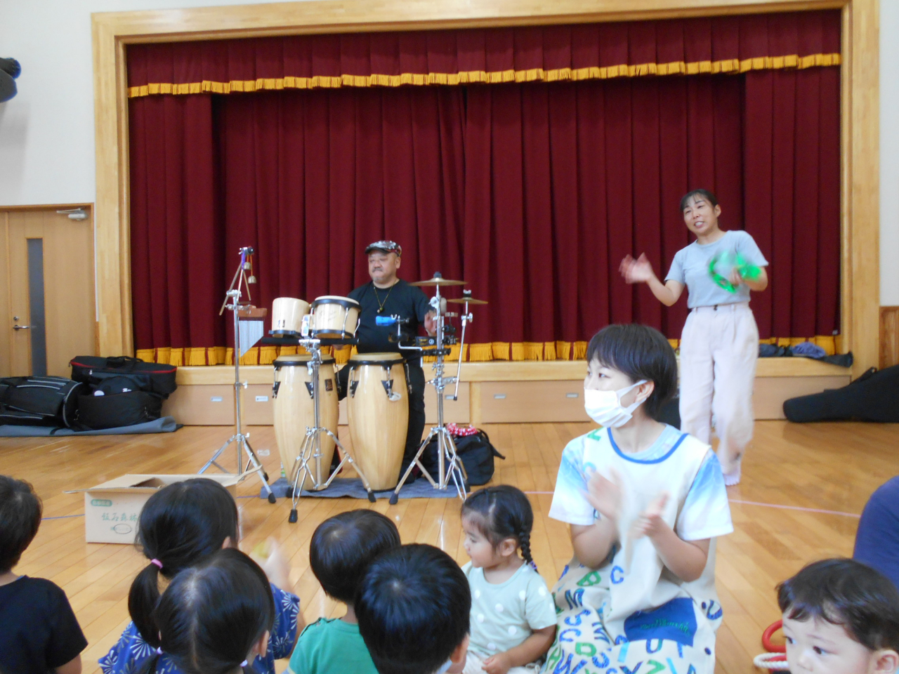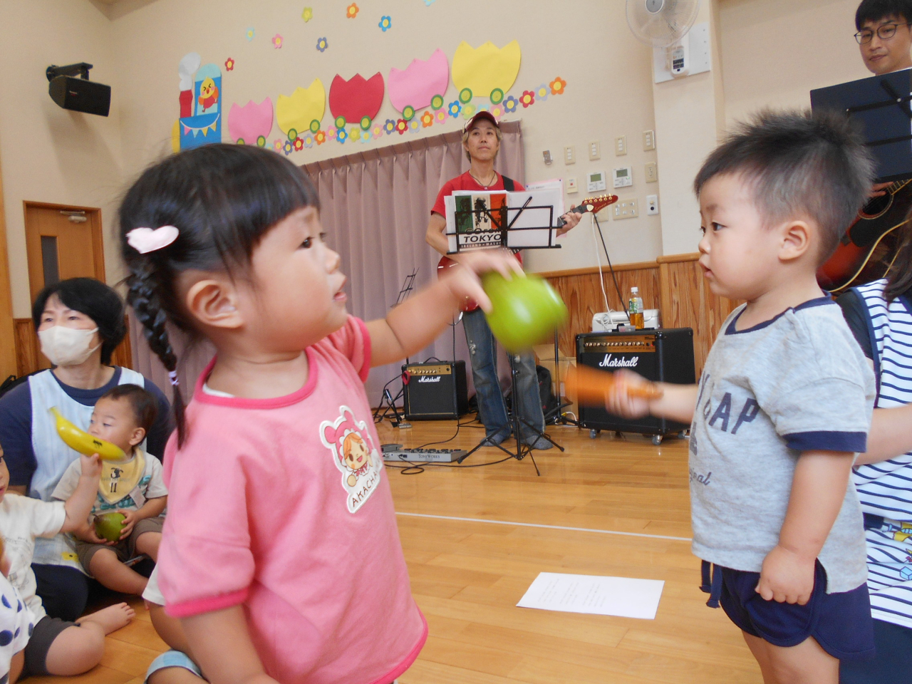 9月16日(土)とっても楽しい音楽会でした。1974のメンバーの方々が色々な楽器を使って演奏して下さいました。子ども達もタンバリンやマラカス、スズを持って一緒に楽しみました。演奏の後は楽器に触れさせてもらったり、音を鳴らしてみたりもさせてもらい、子ども達は興味津々でした。楽しかったね。