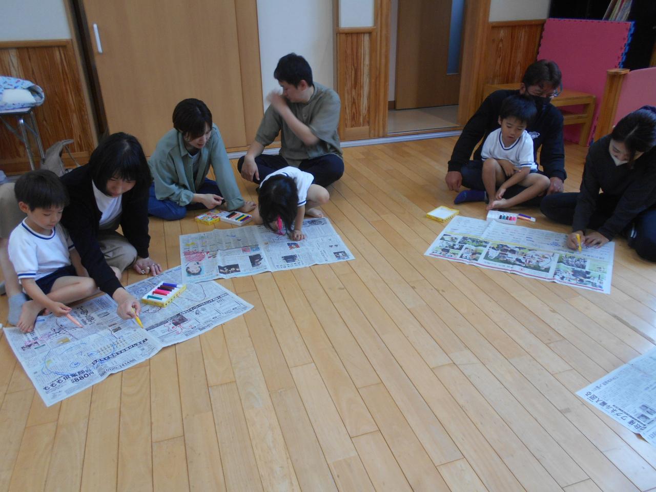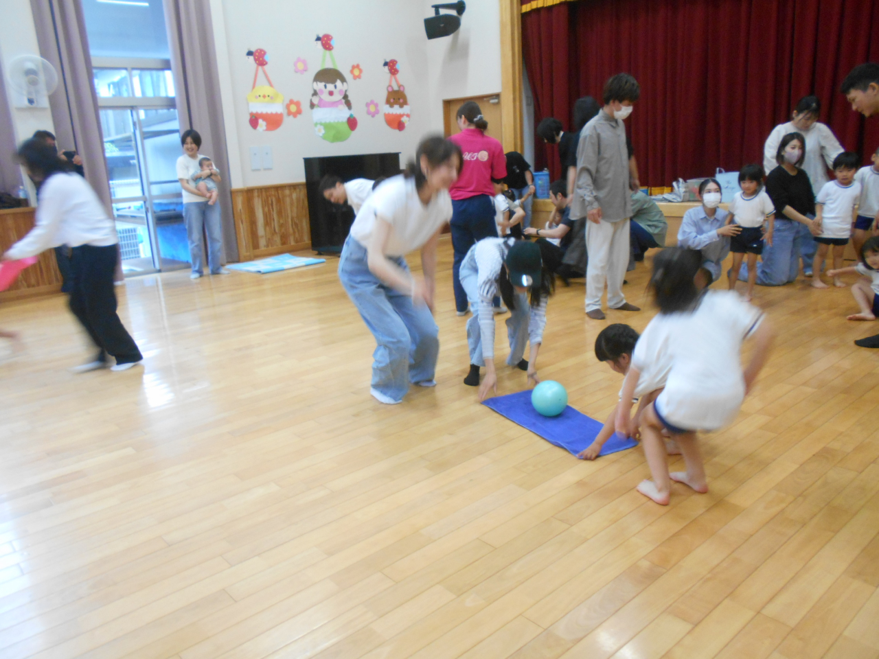 とっても楽しみにしていた行事です。前々から晴れの日バージョン、雨の日バージョンを全体で話し合い決めていました。そして、当日の天気は雨☂雨だけどお家の人と一緒にストレッチや抱っこ、新聞紙で作ったパラバルーン、ボール運びリレーをしました。とーっても盛り上がったね♫ その後はお部屋でコーナー遊びです。したい遊びに誘ってじっくりと遊ぶことができました。子どもたちの嬉しそうな表情をたくさん見ることができた日でした😊ありがとうございました。