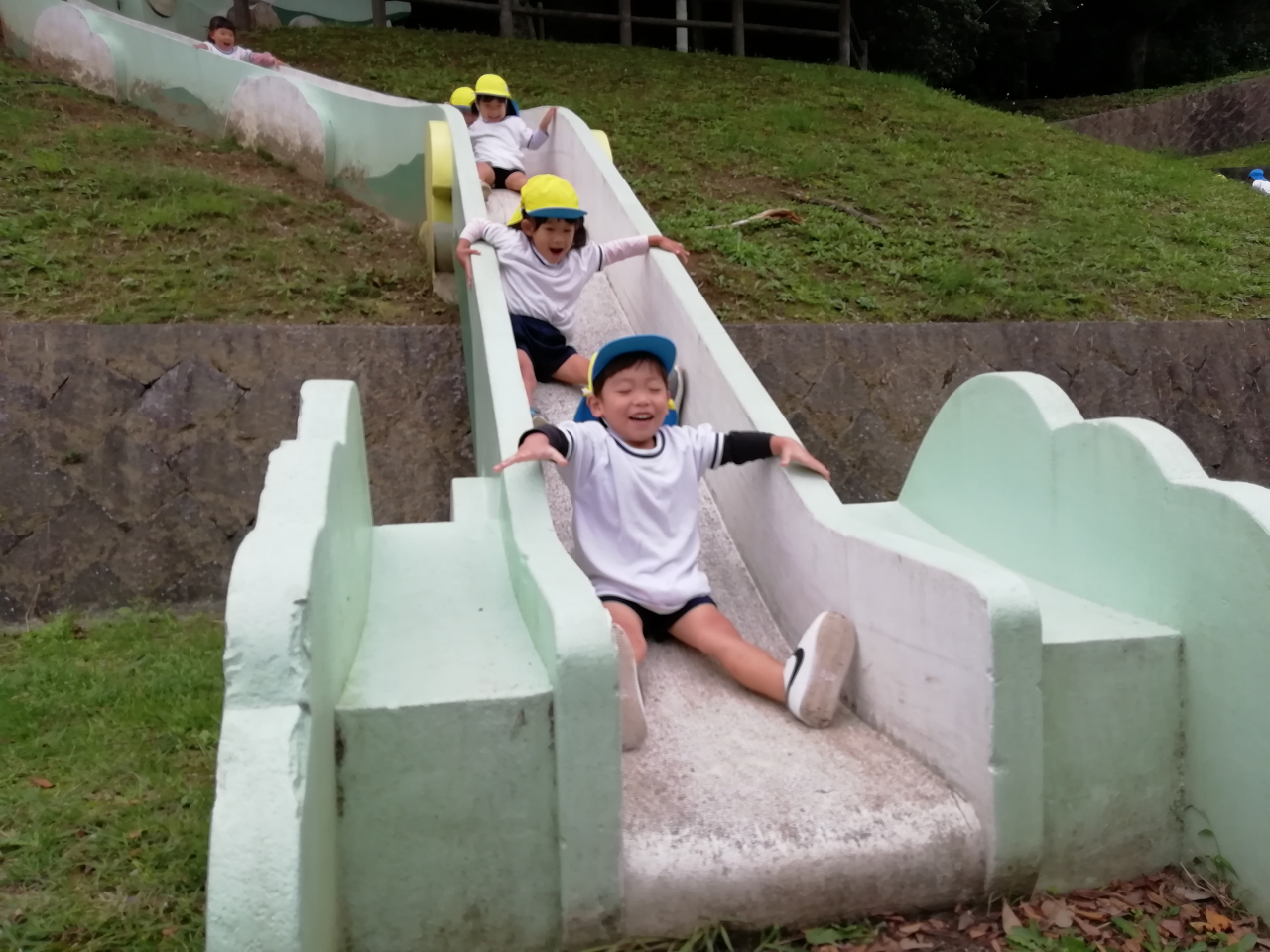 初めての上吉田公園に行ってきました。龍のすべり台で大興奮で、何度も何度も繰り返し楽しむお友だちがたくさんいました。どんぐりやしいの実ひろいやダンゴムシ探しにも夢中になっていました。遠足先で食べるおやつやお弁当は特別でみんな嬉しそうに食べていました。準備等ありがとうございました。「また明日いこー」と帰り道に言っていました♡