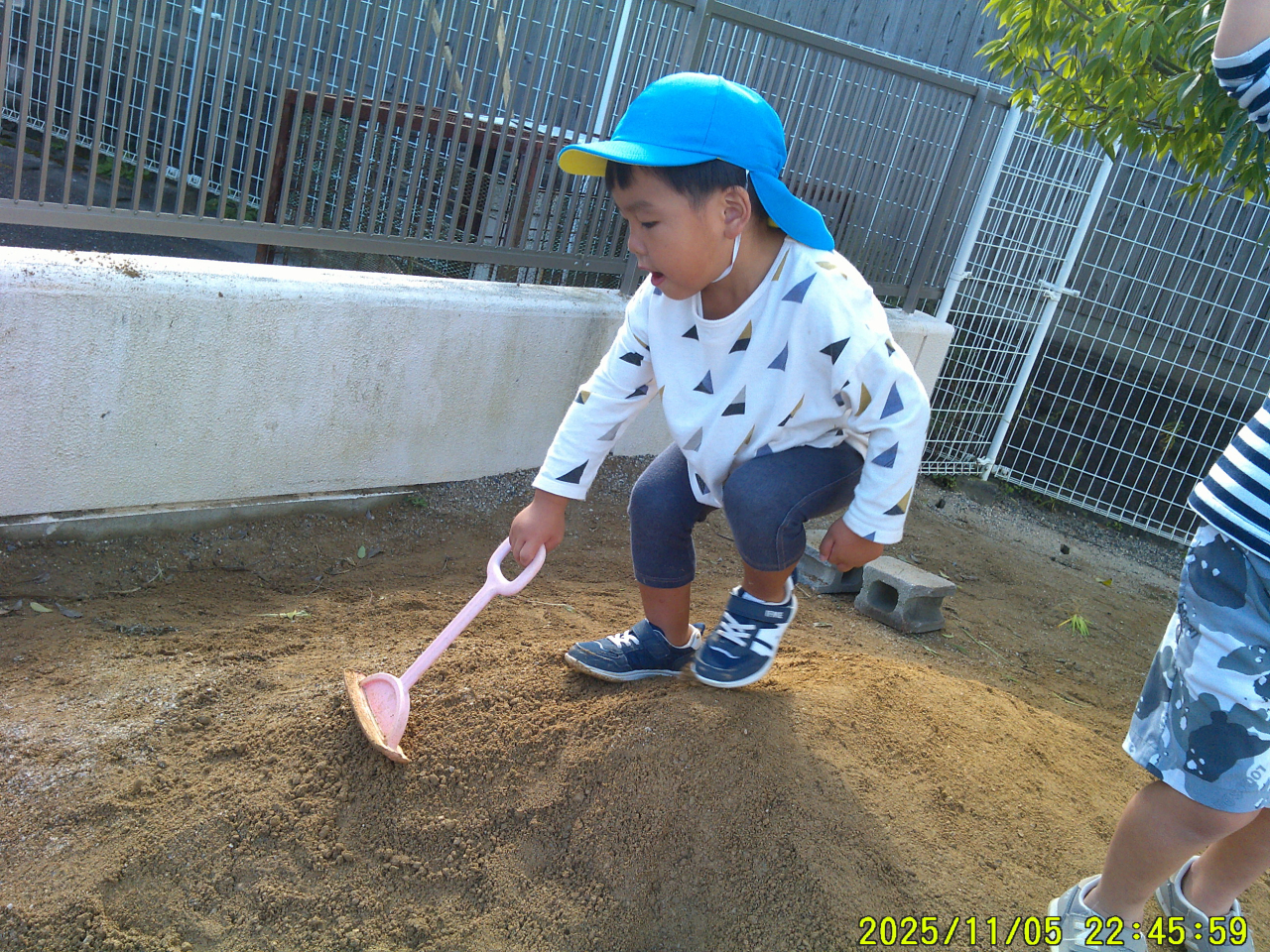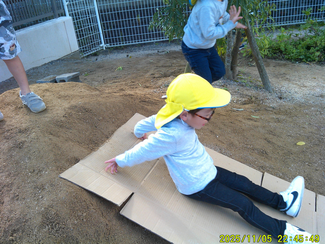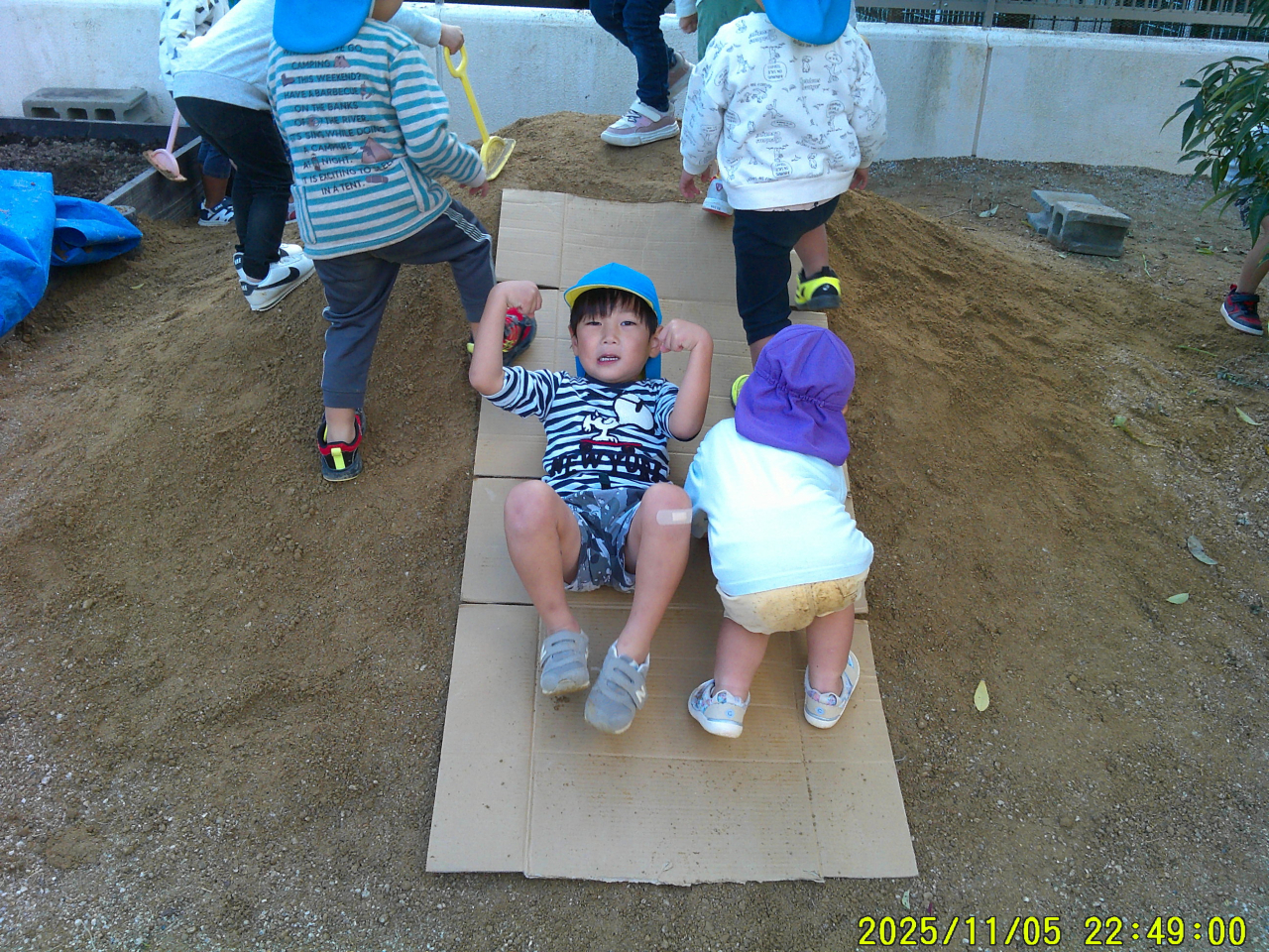 園庭のどんぐりの木の側にある小さな砂山!ここは子どもたちが大好きな場所です。段ボールを敷いてすべったり、どんぐりに手を伸ばしてみたり、楽しそう♡砂山や畑の周りは、いつもお友だちでいっぱいです。