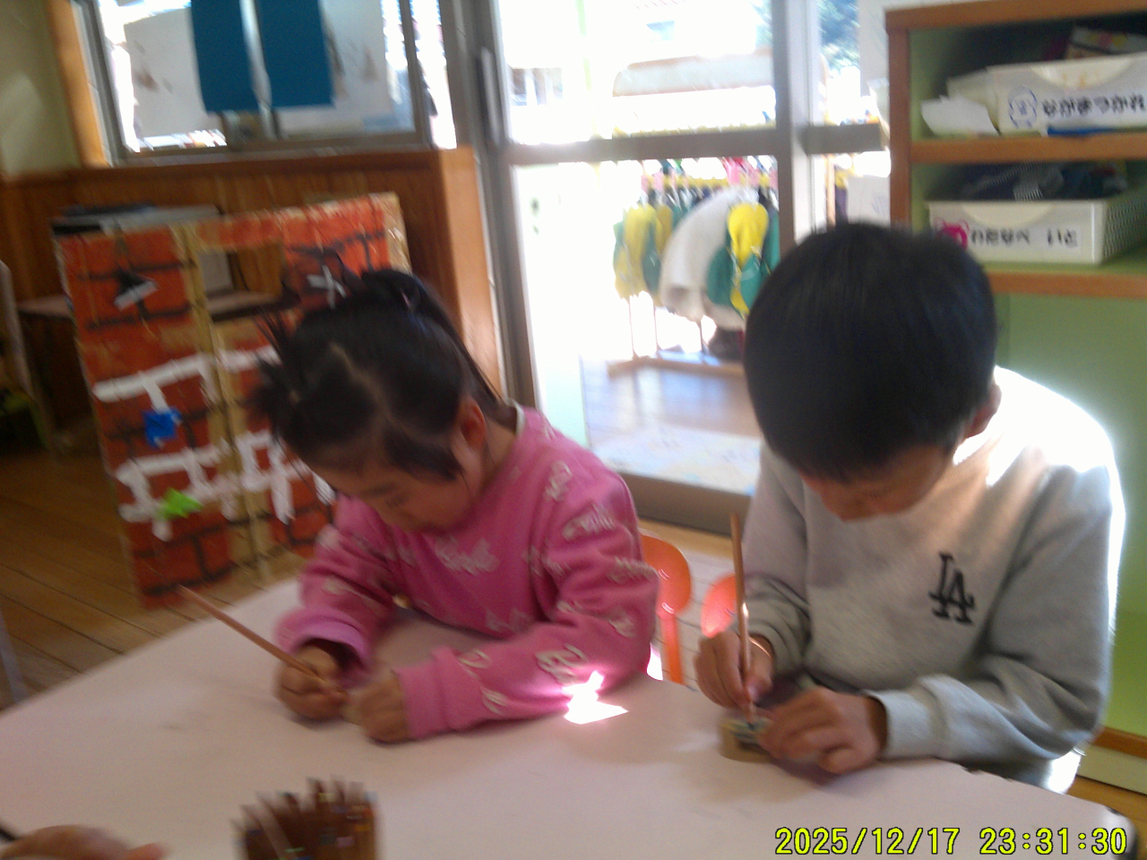 えんぴつけずり作りを体験しました。初めに木や葉っぱの名前や手ざわり、においを体験し「いいにお~い」「無印のにおいがする~」など、色々な意見が出ました。そしていよいよえんぴつけずりへ。やすりで擦り「え~つるつるする~」「やすりが白くなった」とワクワク♪そこから絵を描き、世界で一つだけのえんぴつけずりが出来ました♡持って帰れることがわかると更に目がキラキラになり大喜び!!「お姉ちゃんに見せよ~」「家族に見せよ~」と最後までキラキラワクワクなめろんさん達でした。4月から小学生。大切に使ってくれると嬉しいな♡来月は親子でイス作り。楽しみです😊