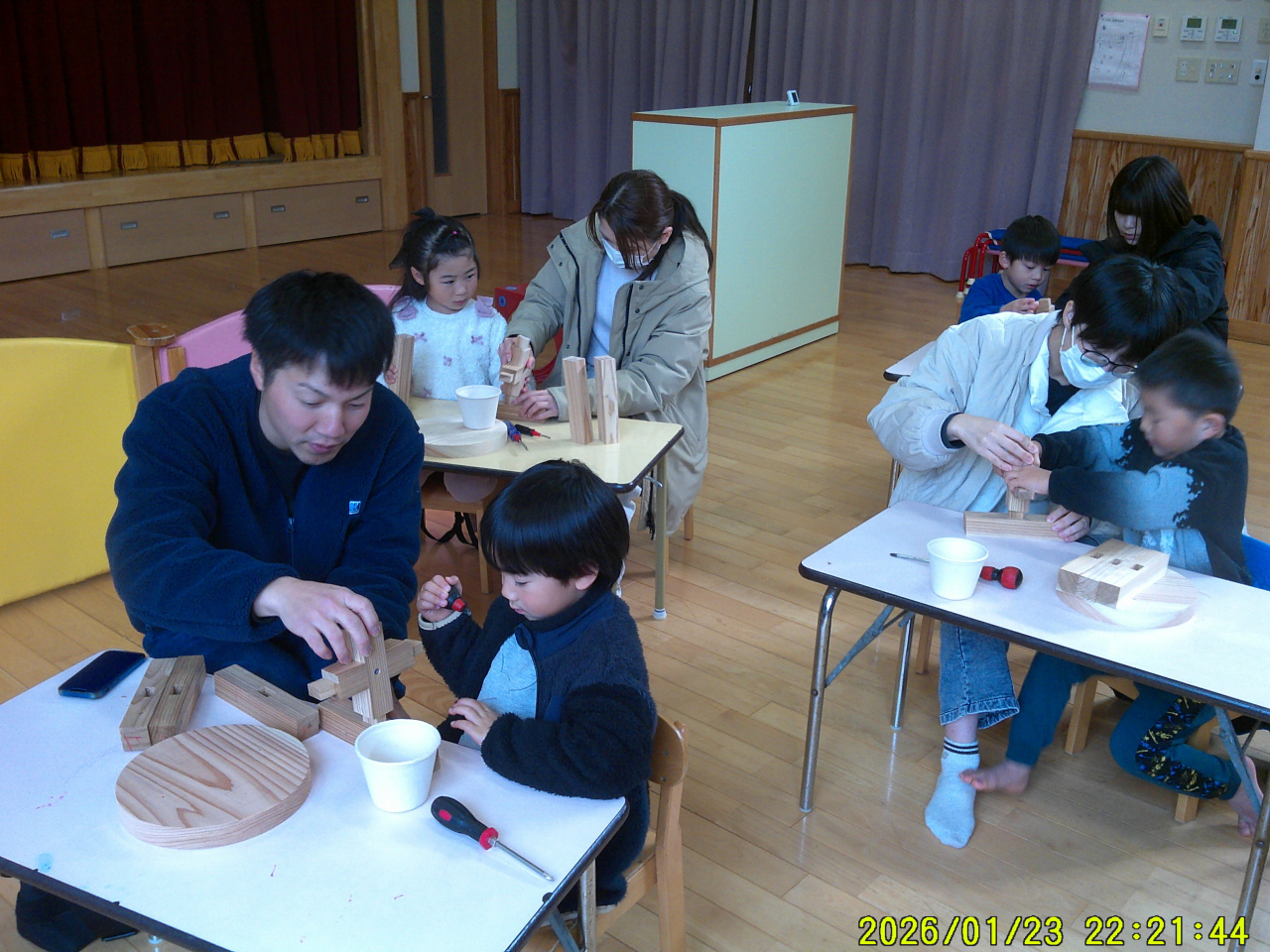 24日(土)コアラッチさんをお招きし、親子で椅子を作りました。はめこみから、ネジ入れ、やすりでこするなど体験し、やる気と楽しさでギラギラしていました☆「こうしたらいいんじゃない?」「ここ押さえとって」など、やりとりをしながら、親子で力を合わせて一つの物を作り上げる様子はとてもステキでした♡できた椅子は記念に持って帰りました。家で「絵を描いたよ」「シール貼った」「ニス塗ってくれるって~」など、更に作りあげられた様子です😊