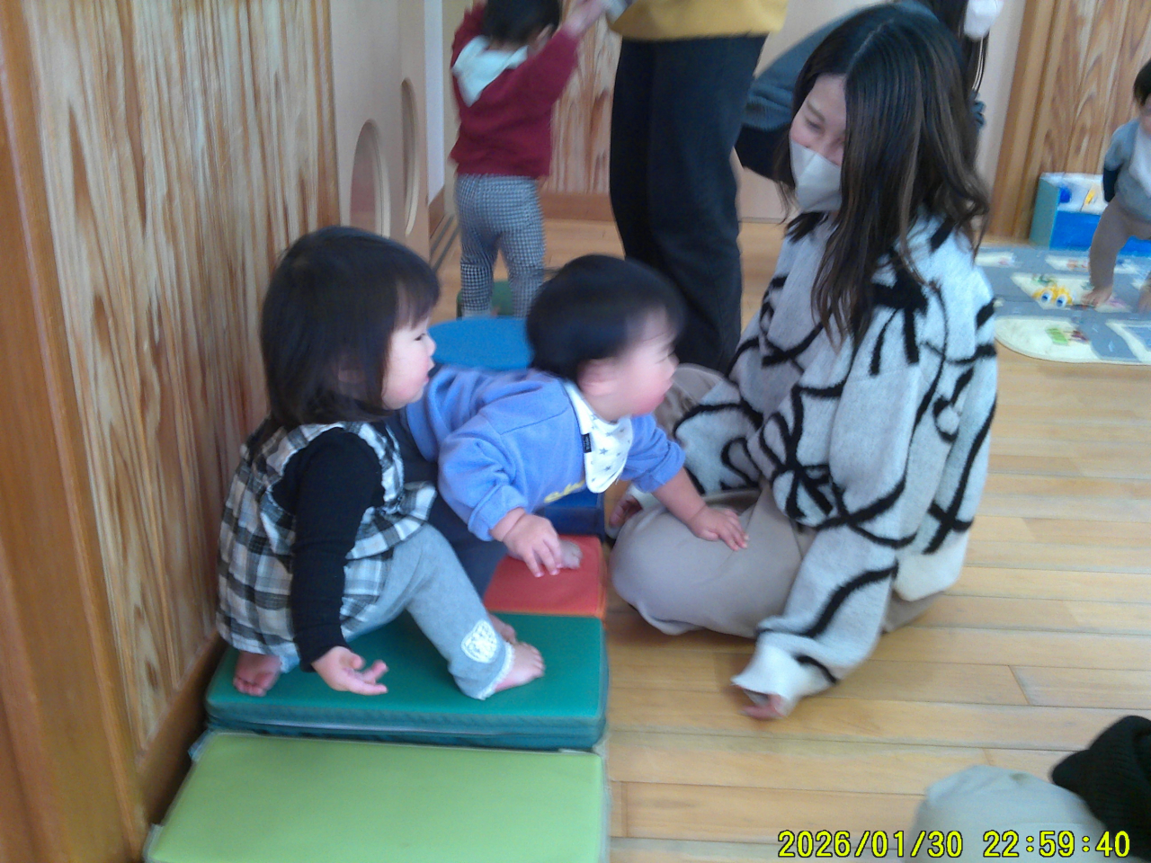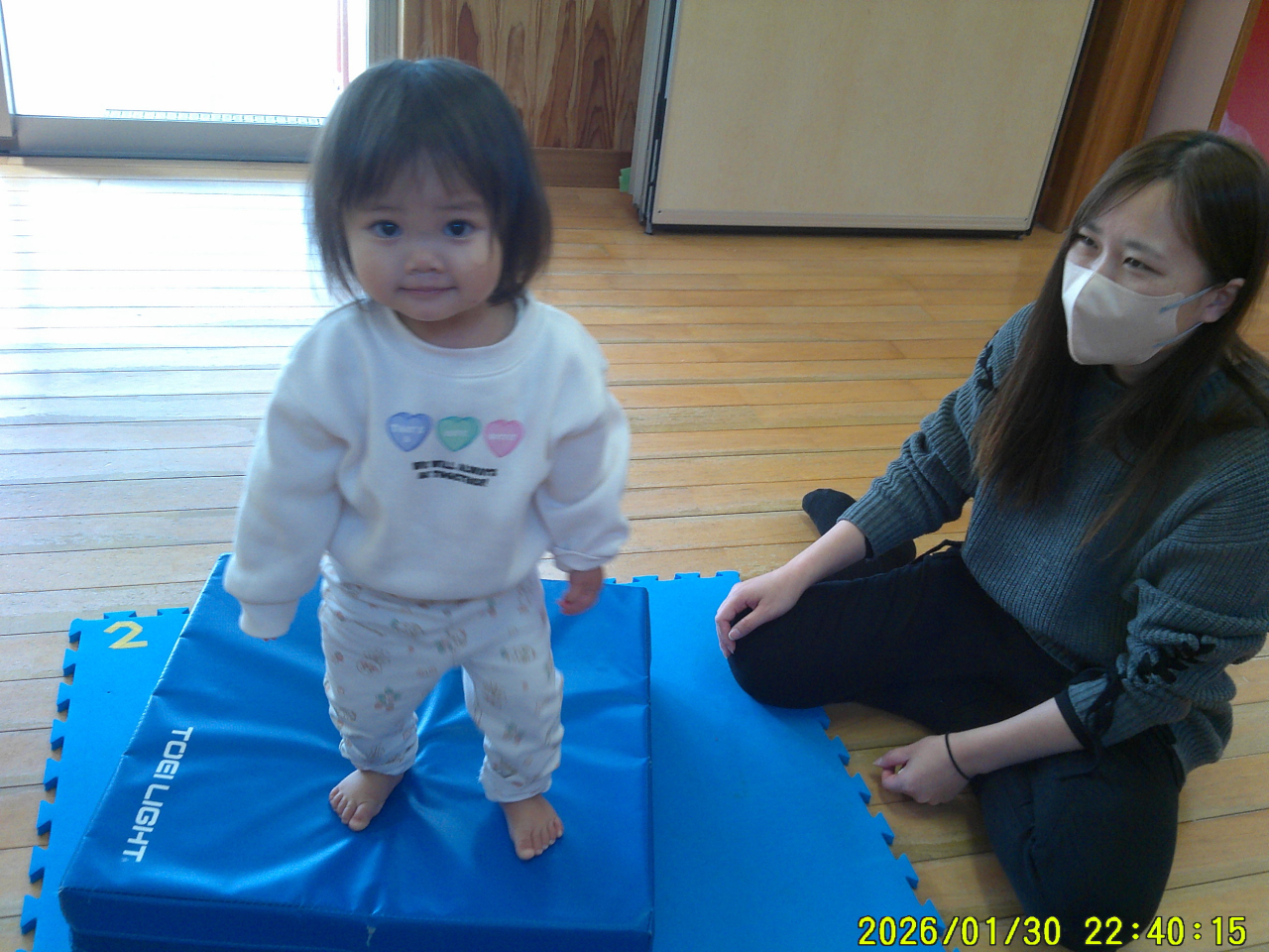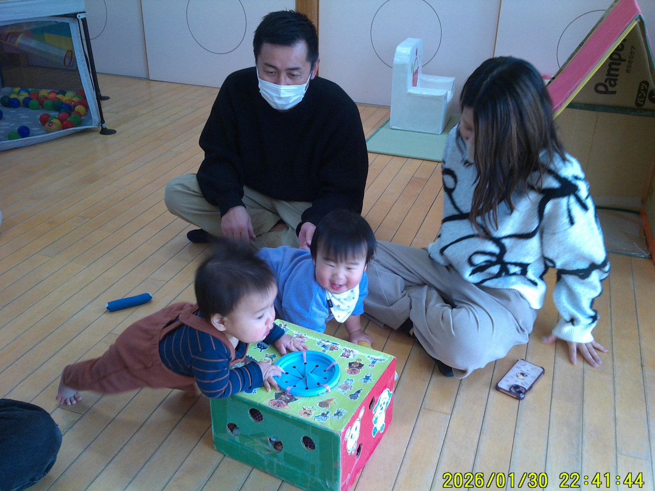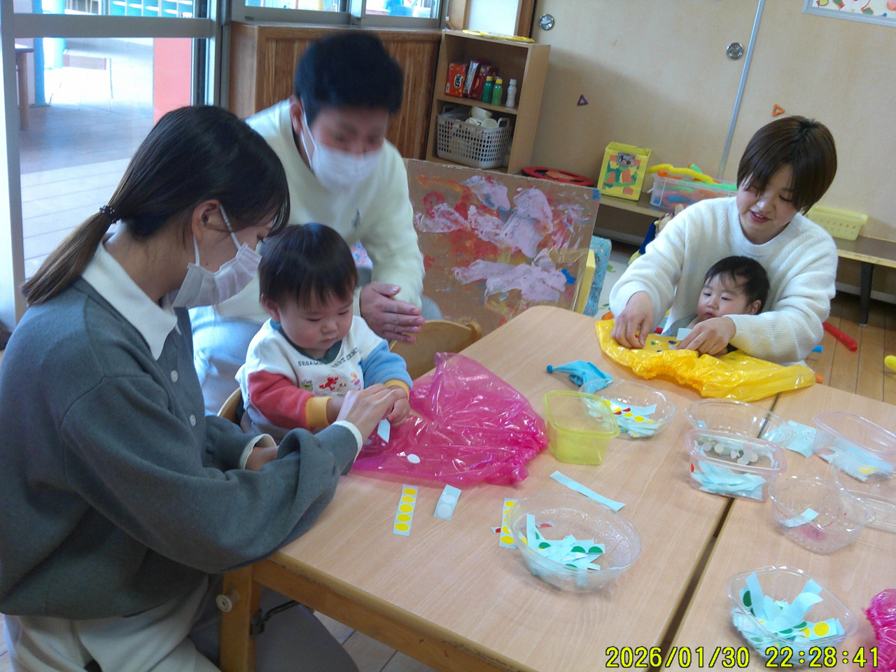 1月31日(土)今年度2回目の親子活動でした。子どもたちはお父さん、お母さんと一緒にお部屋の中へ・・・不思議そうな、でも嬉しい表情がみられました。大好きな歌を歌ったり、音楽に体をゆらしたり、かわいい姿も見てもらえました。活動を開始すると普段のあそびを一緒に楽しんでもらったり、手をつないでふれあいの時間にもなれたと思います。子どもたち、お父さんお母さんの笑顔、楽しそうな姿に私たちもとても嬉しく感じました♡