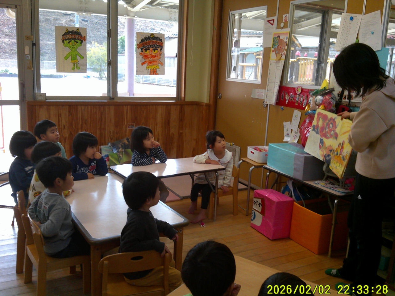 2月3日(火)豆まきをしました。各クラスとても楽しそうに豆まきをしていました。小さいクラスのお友だちは、オニのパンツをはいて園内を歩いていました。大きいクラスのお友だちは、節分について絵本を見たり、自分の心の中にいるオニの絵をかいて、豆を投げてやっつけました。給食の先生も頑張りました。節分ランチおいしかったです