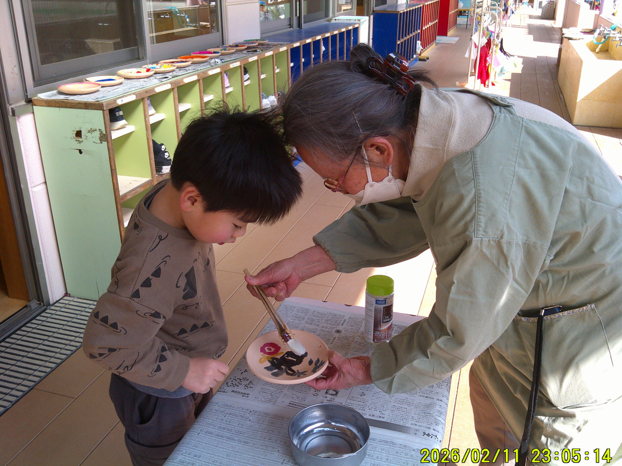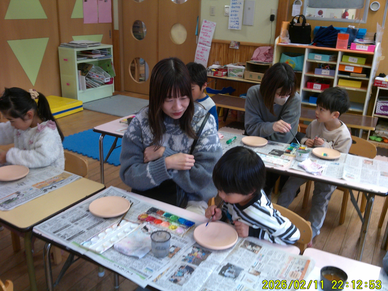 2月12日(木)今年も福郷様にお世話になり、お皿に絵を描きました。何を描こうか決めていたお友だちもいて、サッと描きはじめたり、じっくり考えゆっくりと描きはじめたお友だちもいました。ニスを塗りお皿がピカピカになったり、色が鮮やかになったのを見て「わぁ~きれい♡」と喜んでいました。ステキなお皿に仕上がりました。
