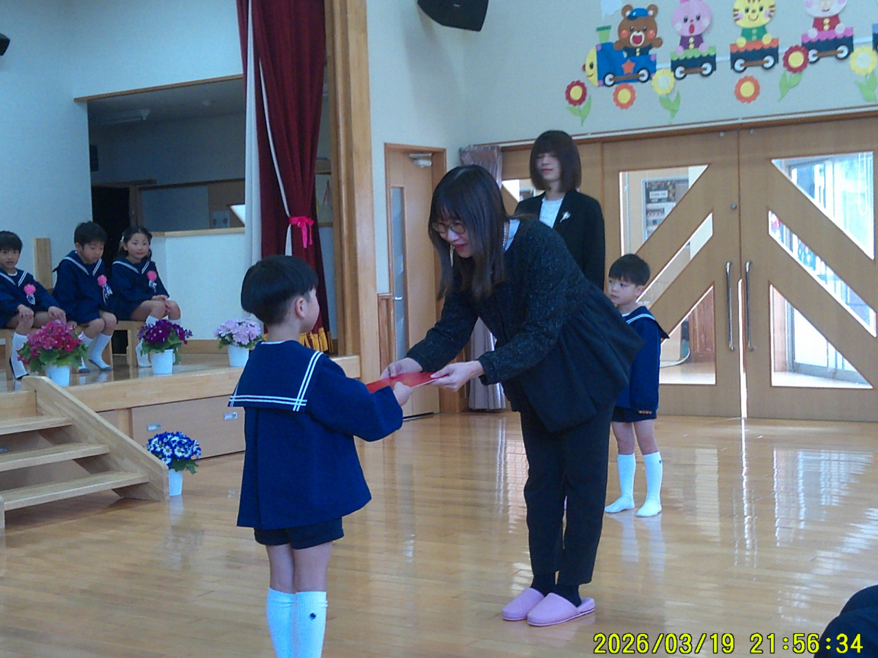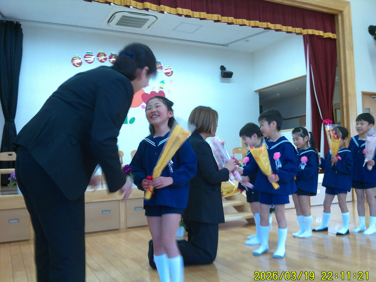 3月20日(金・祝) 令和7年度の卒園式を行いました。前日「ドキドキする!!」と言っていためろん組さん。当日はちょっぴり緊張気味でお家の方と一緒の登園でした。でも・・・さすがです。とっても立派に卒園証書を受け取り、お家の方へ感謝の気持ちを伝えることも出来ました。ステキな1年生になる事でしょうね。残りの一週間、いっぱい遊ぼうね♡