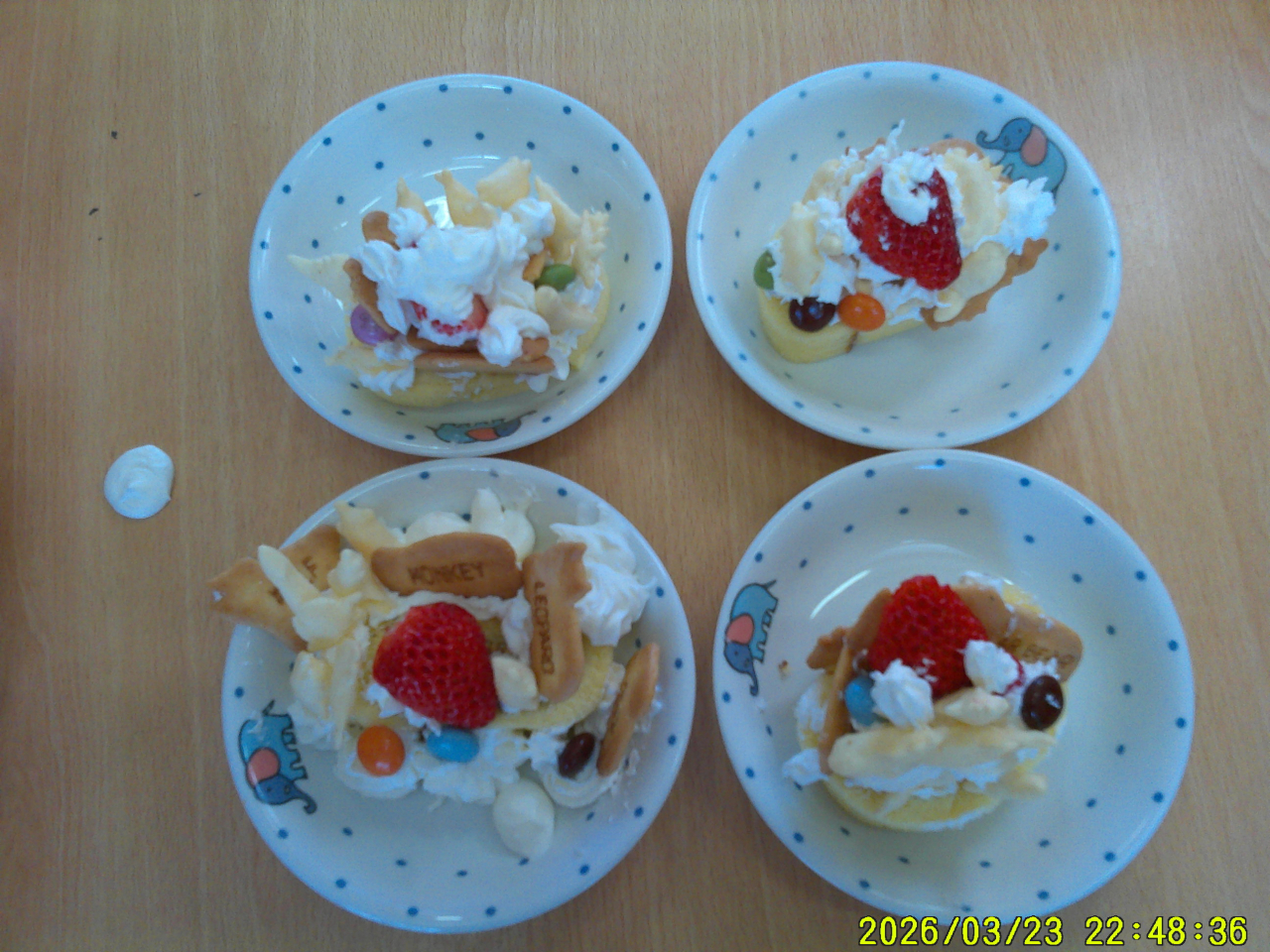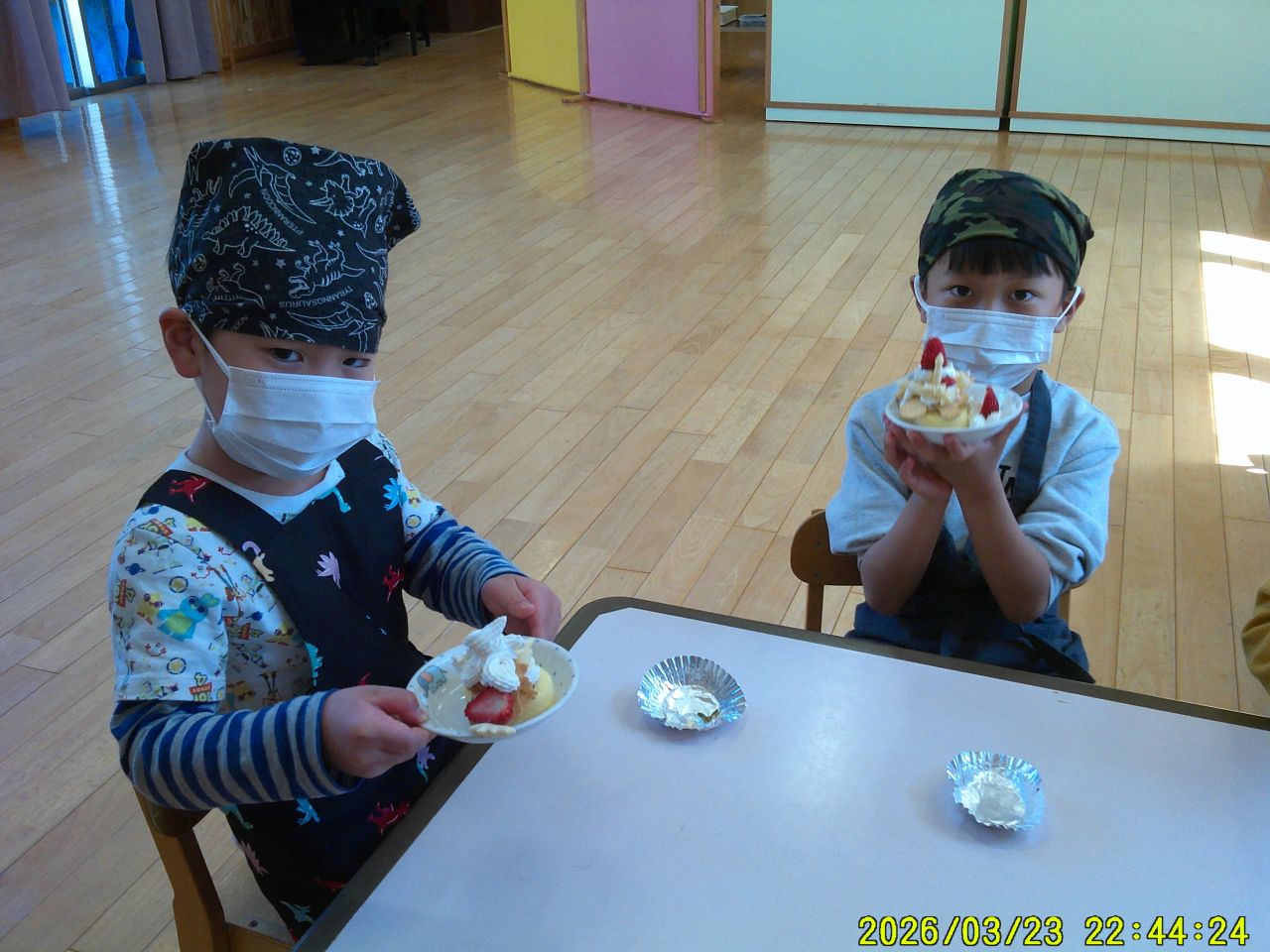 3月24日(火)みんなでケーキを作りました。大きいクラスのお友だちはロールケーキを立てたり横にしたり、色々と考えてトッピング!小さいクラスのお友だちは、いい香りに誘われておもわずパクッ・・・と食べてしまいそうでした