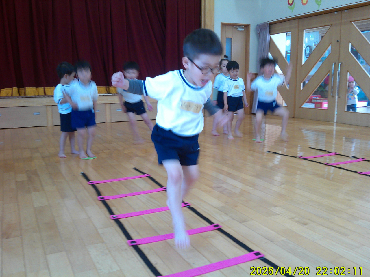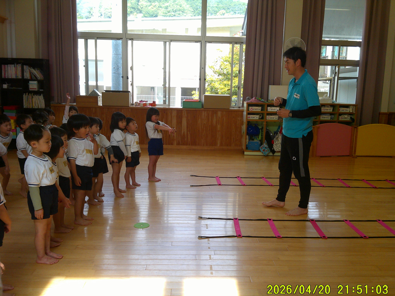 ぶどう組さんにとって初めてのあすトレ運運動教室の日でした。楽しみと緊張でちょっぴりドキドキしていましたが、身体をしっかり動かして楽しみました。はじめにコーチが「たけコーチ知ってる人?」と聞くと半分以上の子が元気よく「はーい」と手をあげていました😊ジャンプをしたり、走ったり、くまやカエルの動きなど・・・ちょっぴり難しい動きにも挑戦!!ぶどうさんのかわいい動きが見れました♡これからも楽しんでいこうね